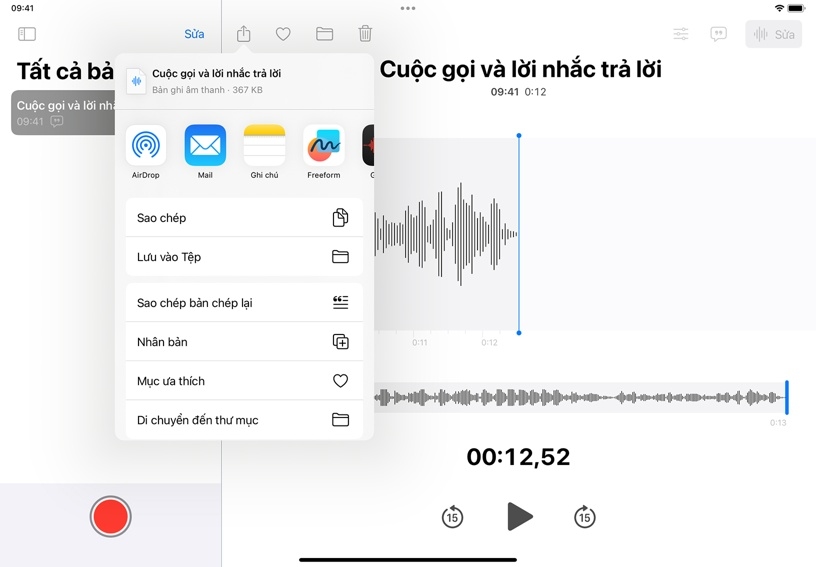 . Bạn có thể gửi bản ghi trực tiếp đến các ứng dụng như iMovie hoặc Ghi Chú. Bạn cũng có thể lưu bản ghi đó vào Tệp để sử dụng trong các ứng dụng khác.