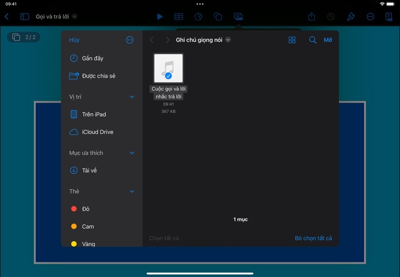Thêm bản ghi Thu Âm vào dự án. Trong Pages, Keynote hoặc Numbers, chạm vào Phương Tiện