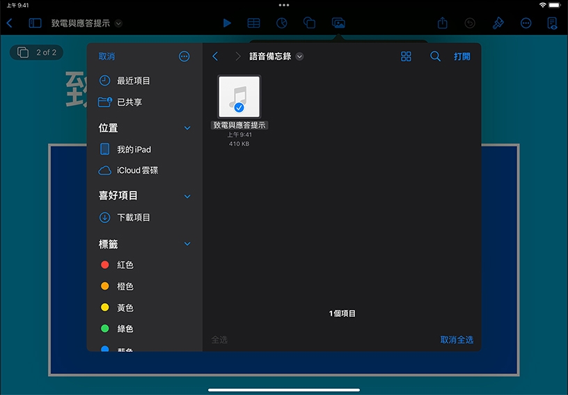 將「語音備忘錄」錄音加到計畫案中。在 Pages、Keynote 或 Numbers 中,點一下「媒體」