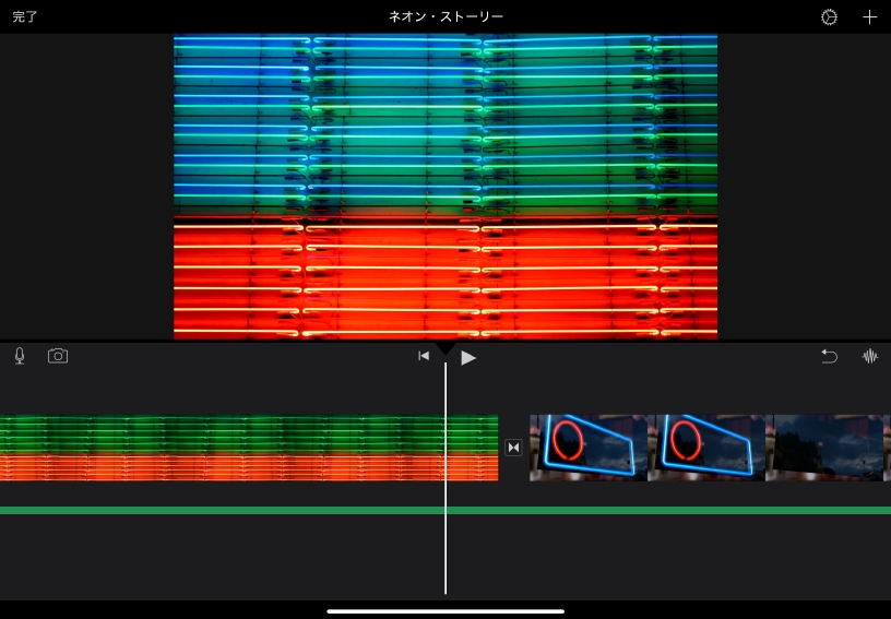 背景用のクリップを追加してみましょう。画面の右上にある「+」ボタンをタップしてメディアブラウザを開き、写真またはビデオを選択して、タイムラインに追加してください。その景色がシーンの背景になります。