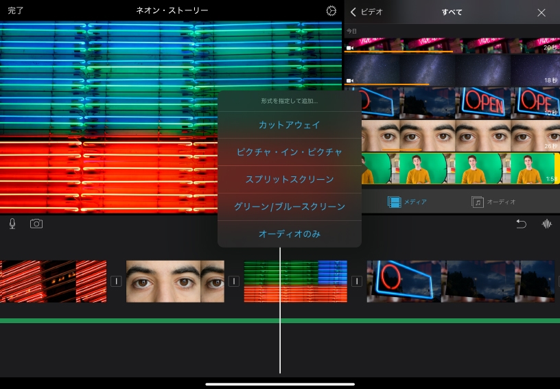 グリーンスクリーンのクリップを追加してみましょう。メディアブラウザで、無地のグリーンまたはブルーの背景の前で被写体を撮影したクリップを選択し、「その他のオプション」ボタン>「グリーン/ブルースクリーン」の順にタップしてください。