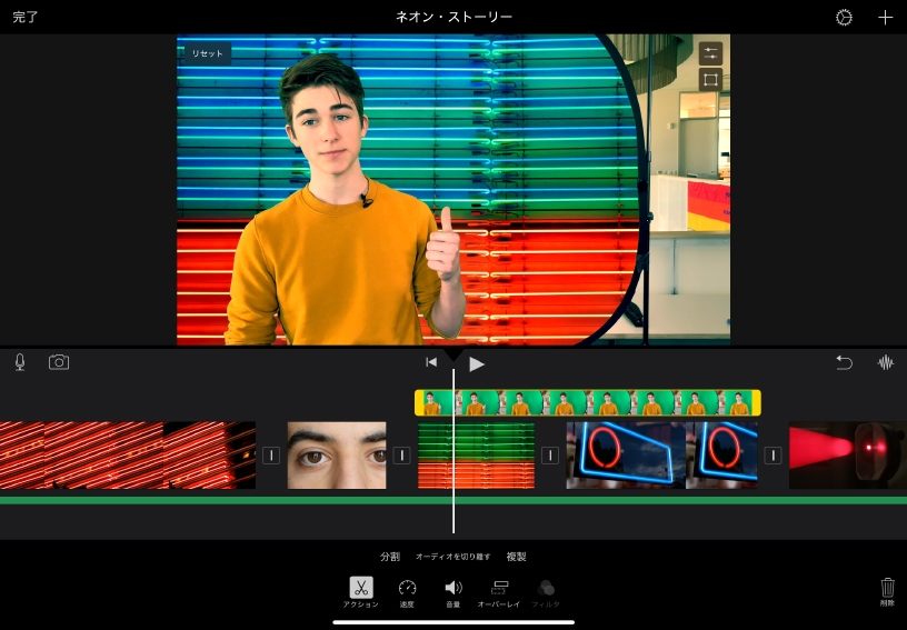 グリーン/ブルースクリーンエフェクトを使うと、オリジナリティの高い画像をムービーに追加することができます。無地のグリーンまたはブルーを背景にした静止画やモーショングラフィックスをKeynoteで作成して書き出し、オーバーレイとして追加してみましょう。
