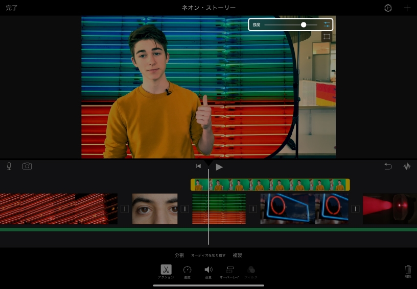 グリーンスクリーン効果を調整してみましょう。グリーンスクリーンの映像をタップしてから調整ボタンをタップし、「強度」スライダをドラッグしてください。削除される緑色または青色の量を調整して、2つの映像を自然になじませましょう。