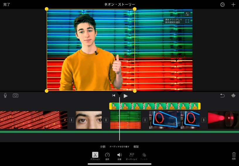 グリーンスクリーンの映像をトリミングしてみましょう。マスクボタンをタップしてからフレームの四隅をドラッグすると、グリーンスクリーンのクリップから表示したくない部分を取り除くことができます。