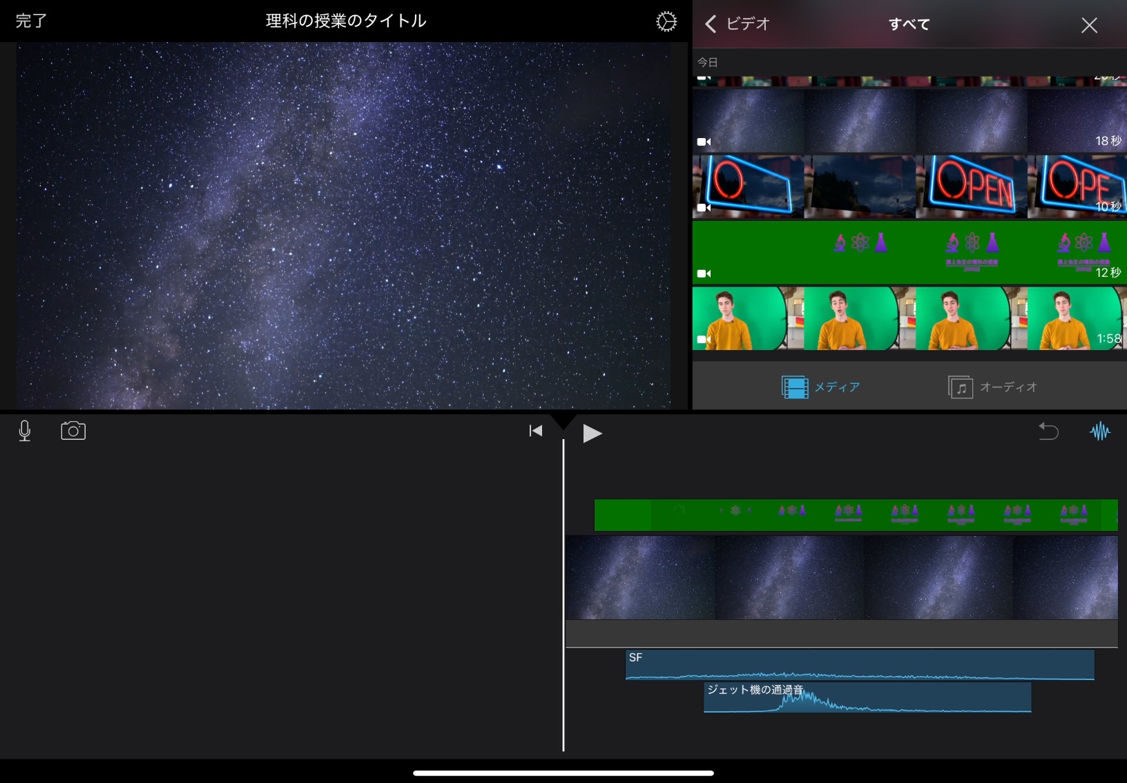 iMovieを使うと、無地のグリーンまたはブルーの背景の前で撮影したビデオクリップから被写体を切り離して、別のクリップの背景に重ねることができます。歴史的建造物の前で人物を撮影したように見せたり、遠く離れた場所からニュースや天気予報を伝えているかのように見せるなど、教室の外に一歩も出なくても、世界中を舞台にして映像を作ることができます。