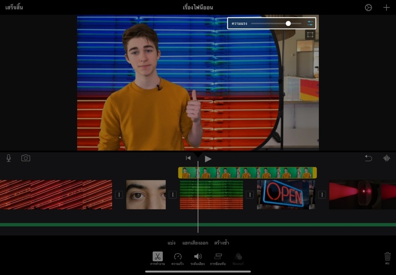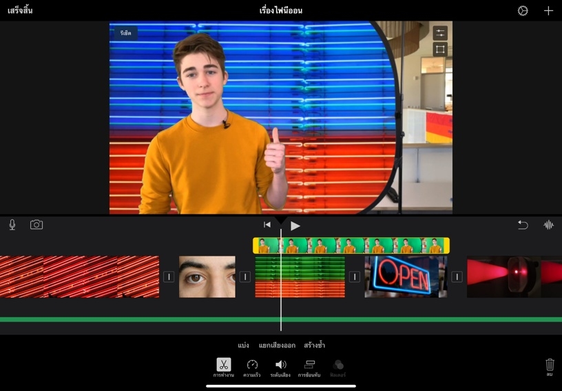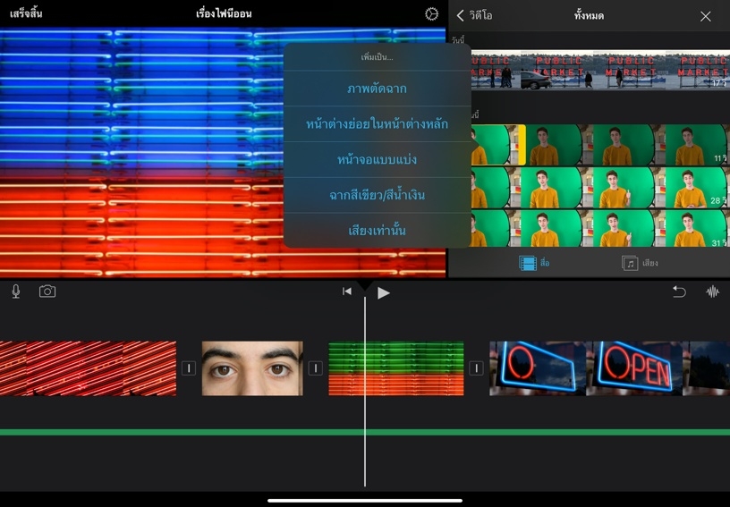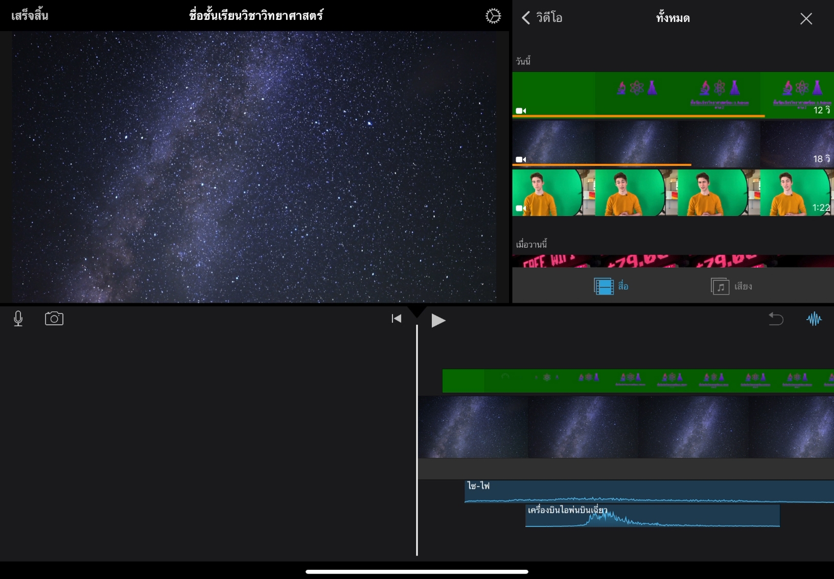 เพียงมีฉากหลังสีเขียวทึบ (หรือน้ำเงินทึบ) คุณก็สามารถใช้ iMovie ตัดภาพตัวแบบในคลิปวิดีโอหนึ่ง แล้วเอาไปวางซ้อนบนภาพพื้นหลังของอีกคลิปหนึ่งได้ การรวมคลิปในลักษณะนี้ช่วยให้คุณสร้างช็อตสนุกๆ ของผู้คนในฉากอันตื่นตา หรือทำคลิปคนยืนรายงานข่าวหรือสภาพอากาศในสถานที่ห่างไกลได้ ซึ่งทั้งหมดนี้ทำได้โดยไม่ต้องออกจากห้องเรียนด้วยซ้ำ