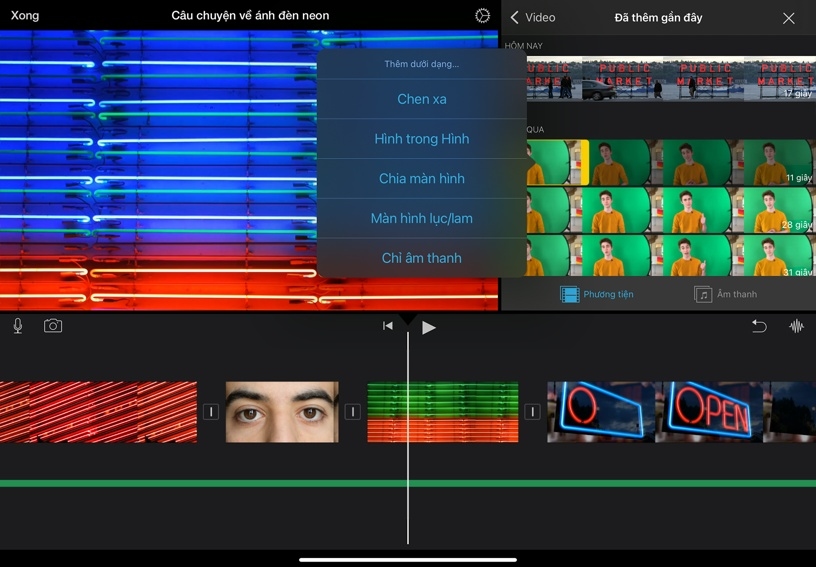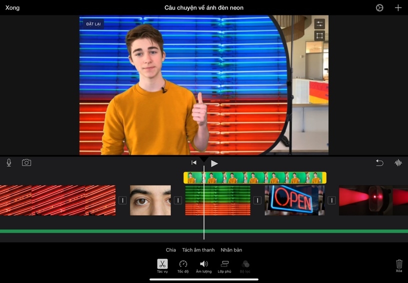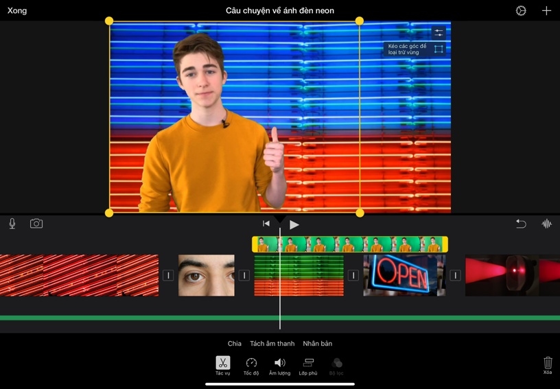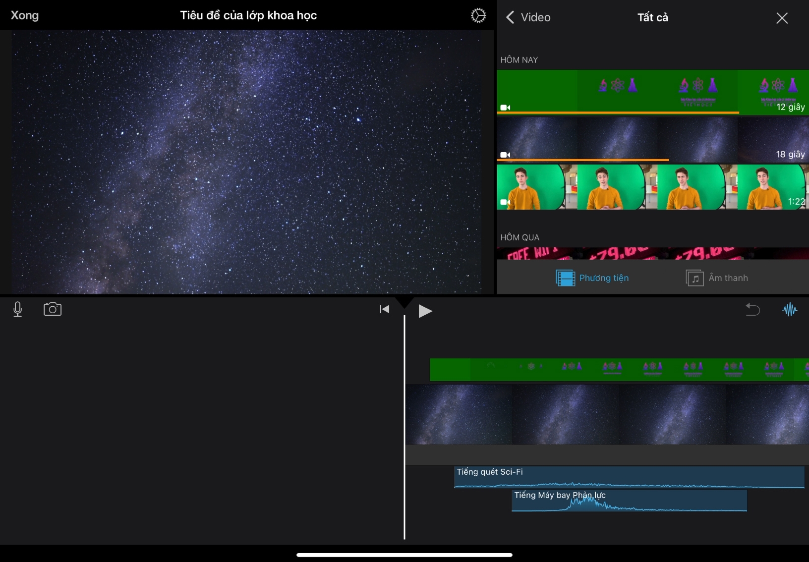 Bằng phông nền đơn giản màu lục (hoặc lam), bạn có thể sử dụng iMovie để tách chủ thể của một clip video và xếp chồng chủ thể đó lên trên nền của clip thứ hai. Khi kết hợp các clip theo cách này, bạn có thể tạo ra những cảnh quay vui nhộn của mọi người trong bối cảnh ấn tượng hoặc đứng ở những vị trí xa để xem tin tức và dự báo thời tiết – tất cả mà không cần rời khỏi lớp học.