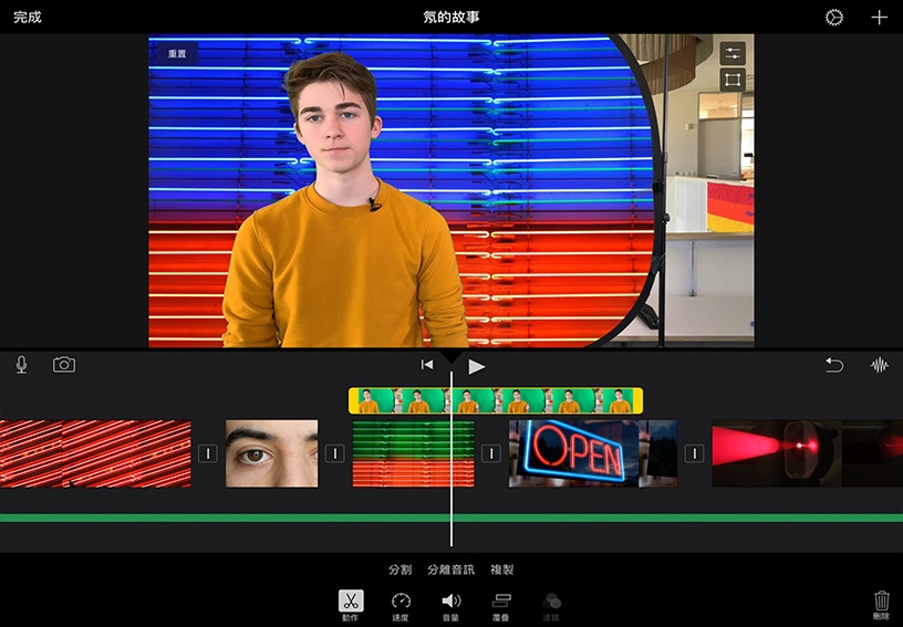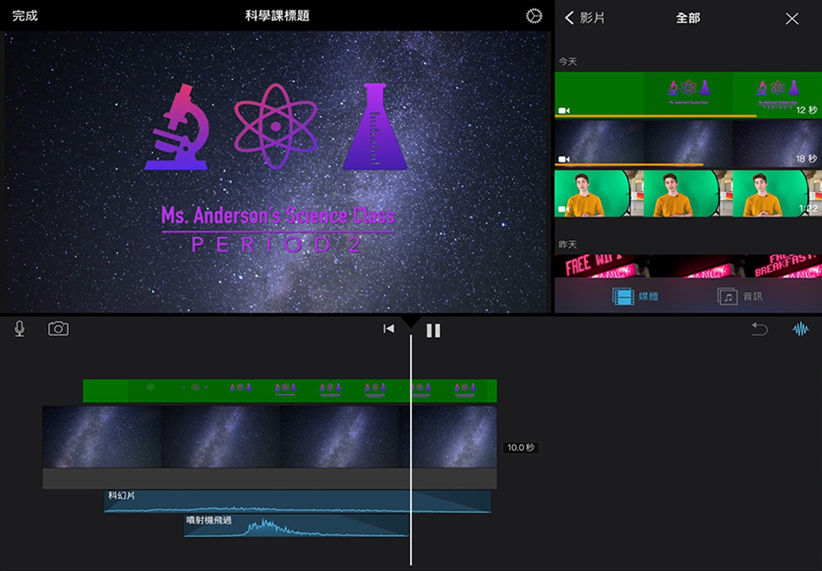 透過簡單的綠色 (或藍色) 背景,你可以使用 iMovie 獨立出影片剪輯片段中的主體,然後疊印在另一個剪輯片段的背景上。運用此方式來合併剪輯片段,你完全不用離開教室便能製作出有趣的鏡頭,讓人物位於戲劇化的場景中,或身處異地播報新聞和天氣預報。