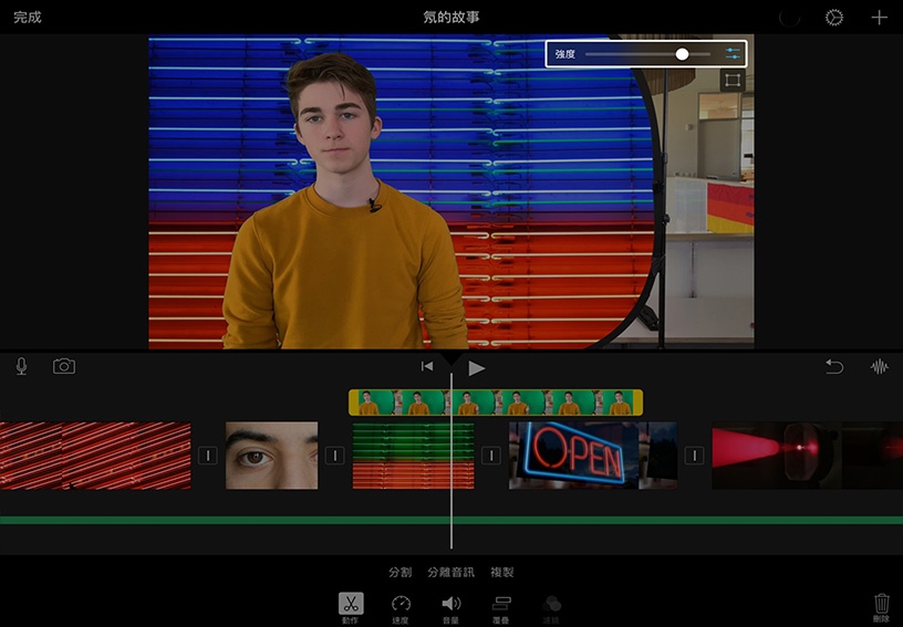 ,並拖移「強度」滑桿,改變從背景移除綠色或藍色的程度,為這兩個鏡頭製作最逼真的調和效果。