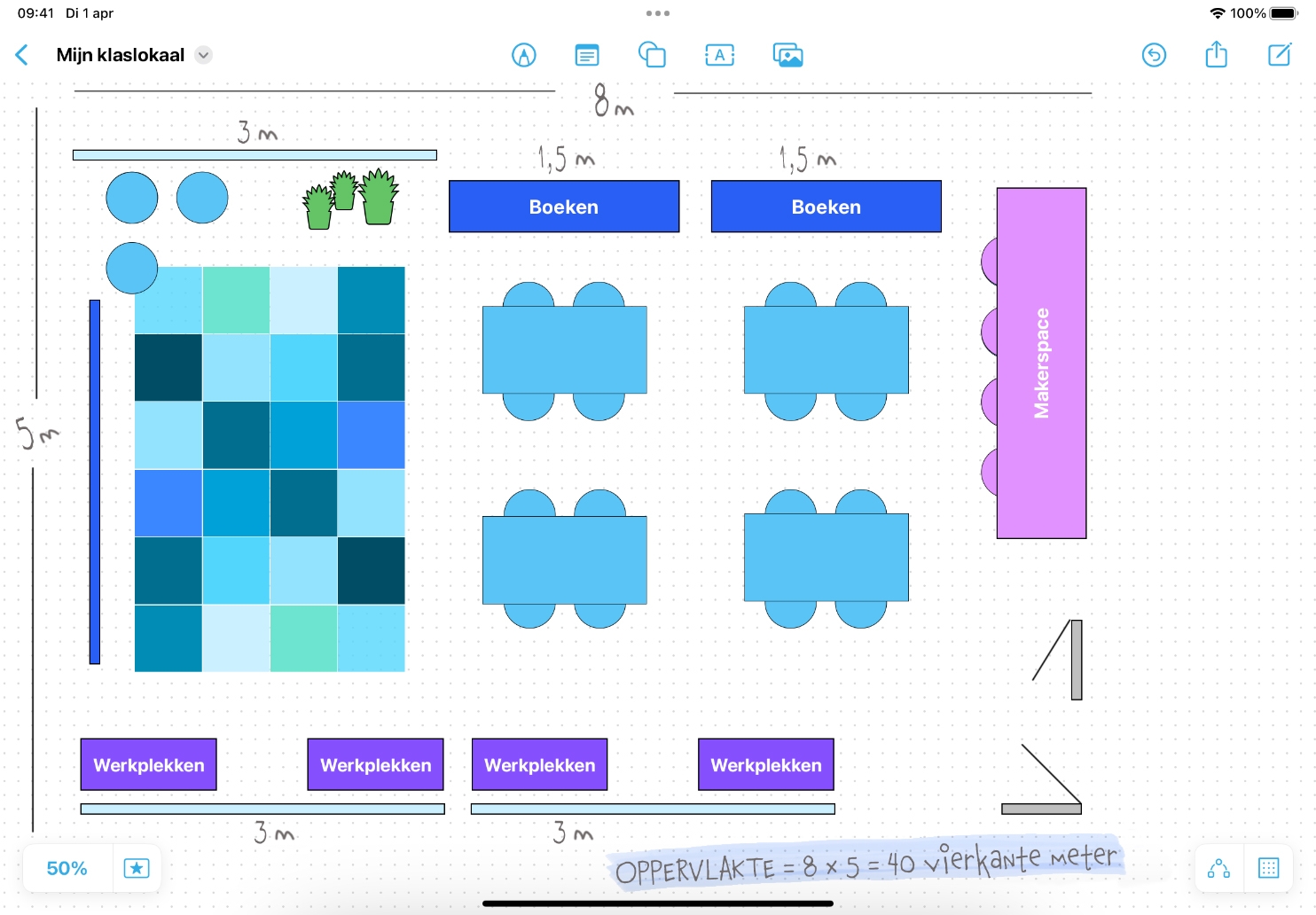 Ga verder. Gebruik Freeform en Apple Pencil om een tekening op schaal te maken van een klaslokaal (of een andere ruimte). Je kunt objecten uit de echte wereld opmeten en op kleinere schaal op je bord tekenen.