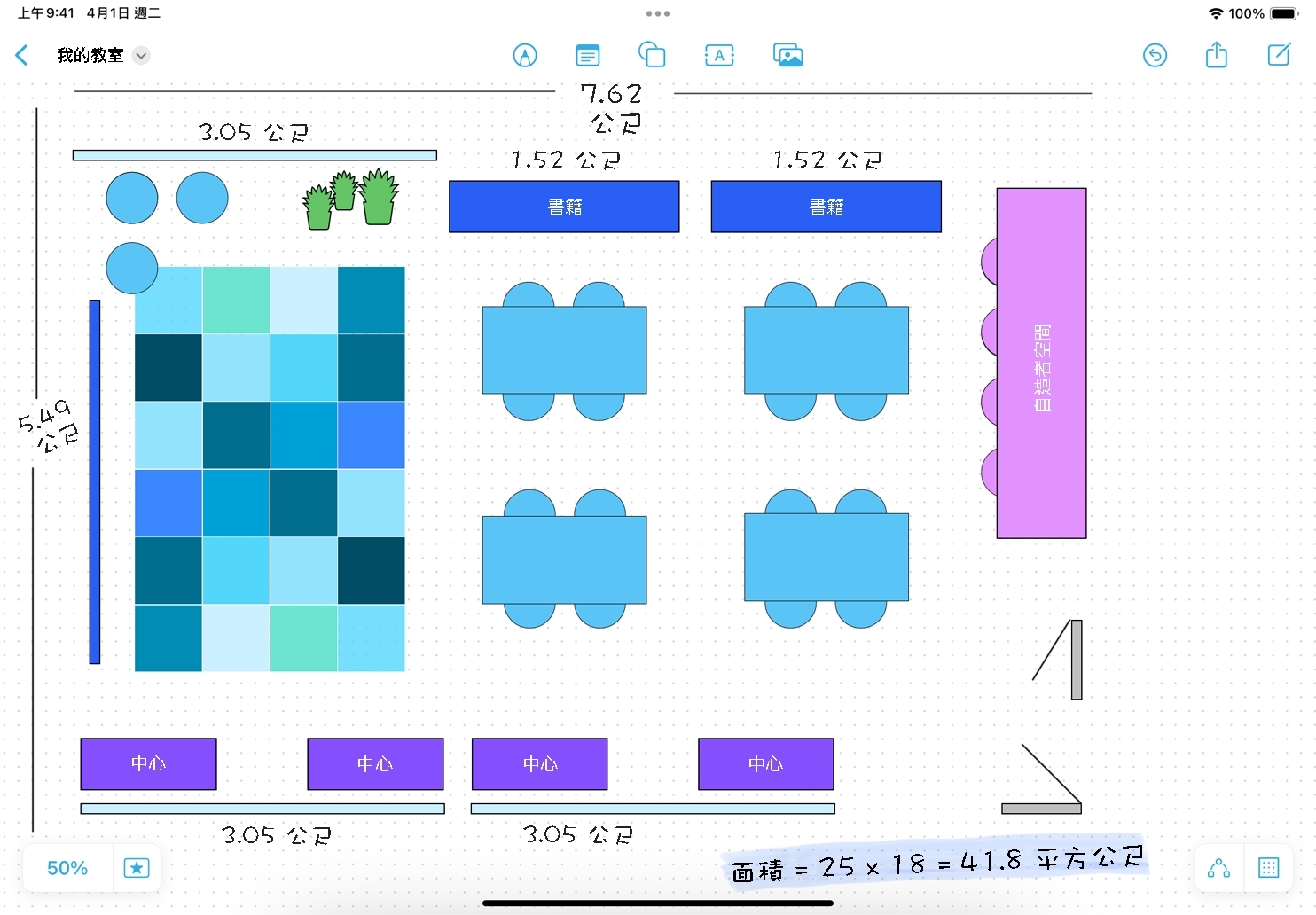 更進一步發揮。使用「無邊記」和 Apple Pencil 依照實際比例畫出教室 (或任何指定區域)。你可以測量現實生活中的物件,然後在白板上畫出縮小比例的圖畫。