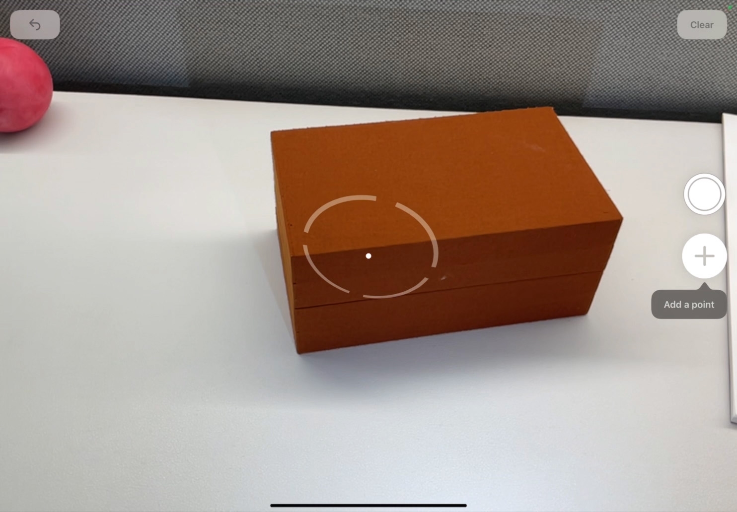 手動測量。找到位於畫面中央的圓點。將畫面中央的圓點置於想開始測量的地方,然後點一下「加入」 加入圓點。慢慢將 iPad 平移到終點,然後點一下「加入」
