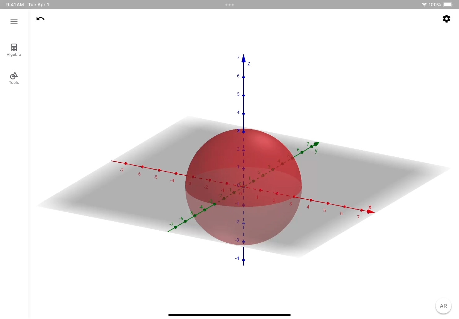 创建球体。在输入栏中,输入方程式 x2 +y2 +z2 =9,然后轻点回车键。3D 图形视图中将呈现一个半径为 3 的球体。
