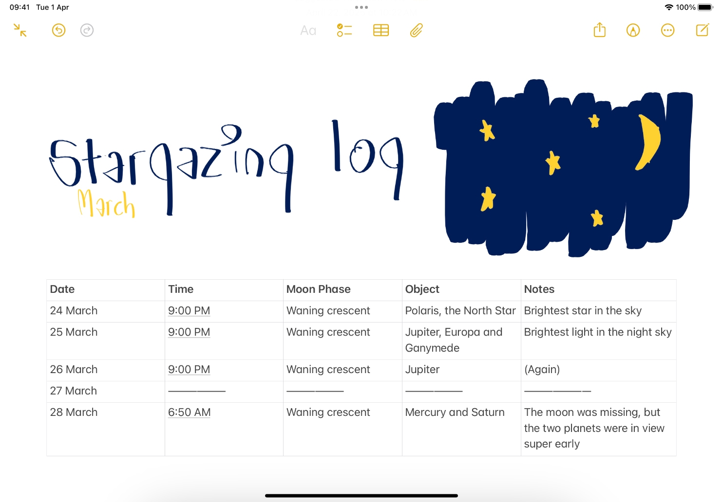 Go further. Use Notes and Apple Pencil to create a stargazing log for a week, month or year. Record observations of celestial objects you see in the sky, including dates, times and what you noticed.