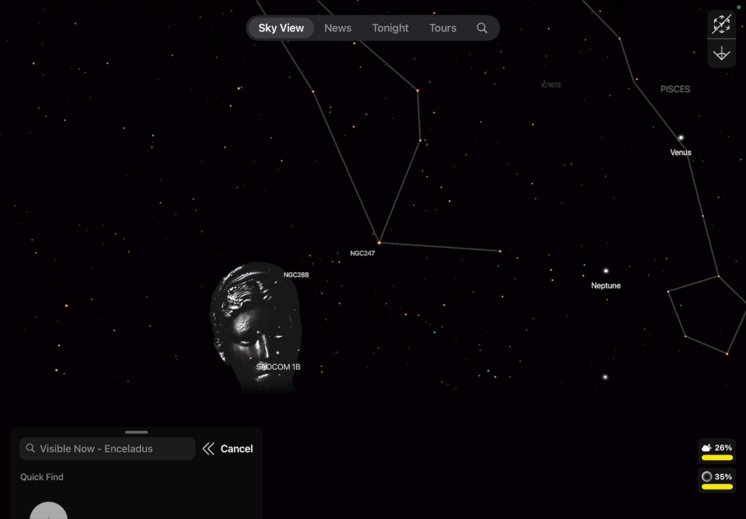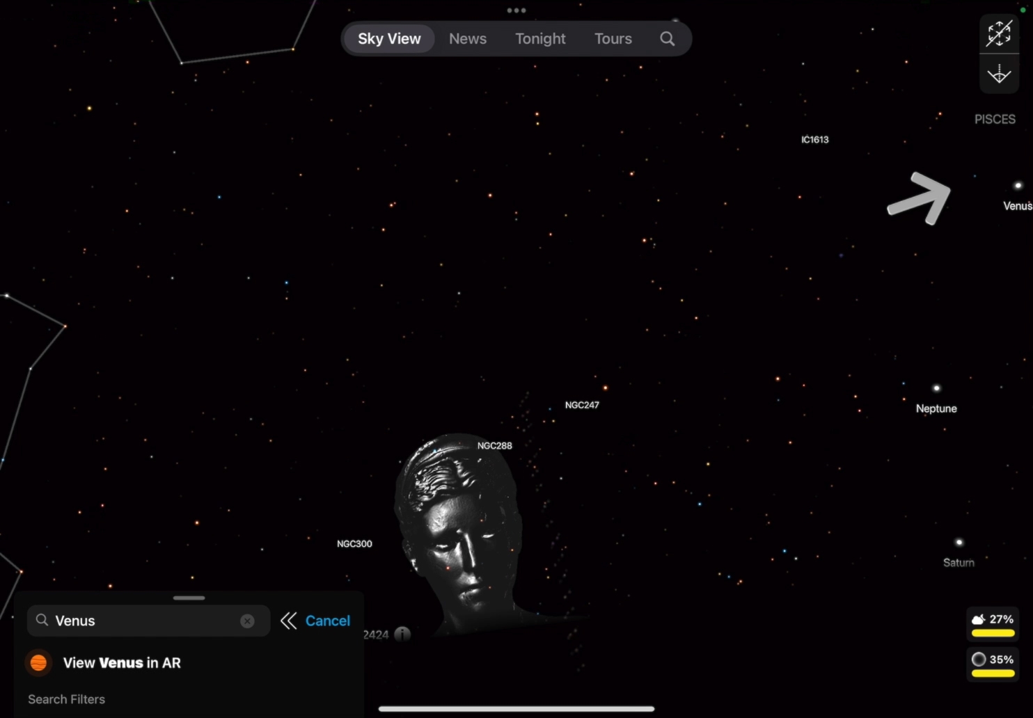 Locate the object in the sky. Tap the blue Directions button. A large arrow will appear; move the camera in the direction of the arrow.