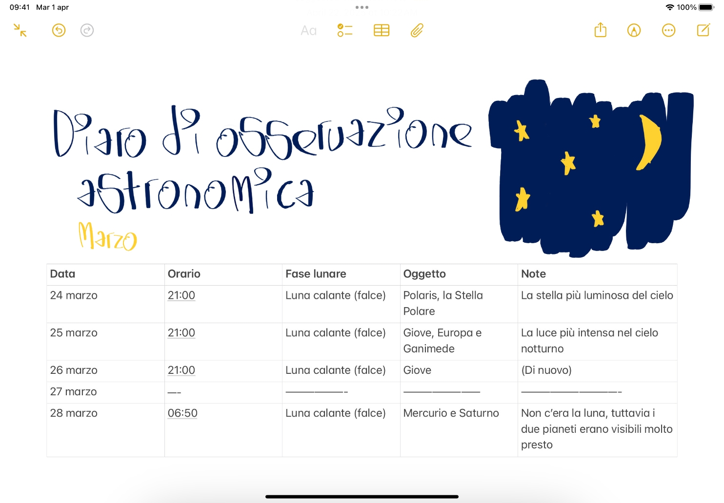 Spingiti oltre. Usa l’app Note e Apple Pencil per creare un registro di osservazioni astronomiche per una settimana, un mese o un anno. Registra gli oggetti celesti che vedi in cielo, includendo date, orari e note di osservazione.