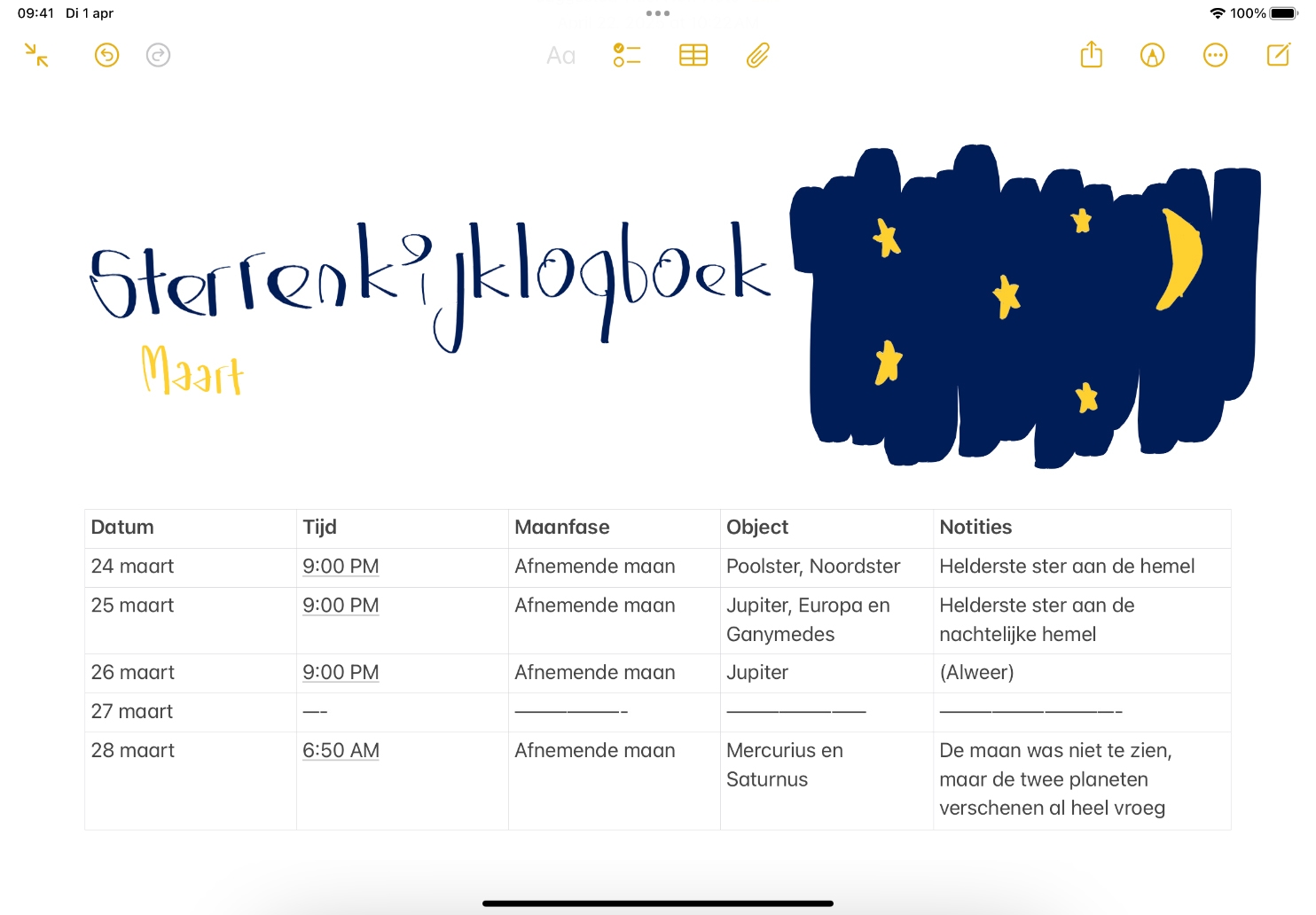 Ga verder. Gebruik Notities en Apple Pencil om een sterrenkijklogboek te maken voor een week, maand of jaar. Leg waarnemingen vast van hemellichamen die je hebt geobserveerd, inclusief de datum, de tijd en je waarneming.