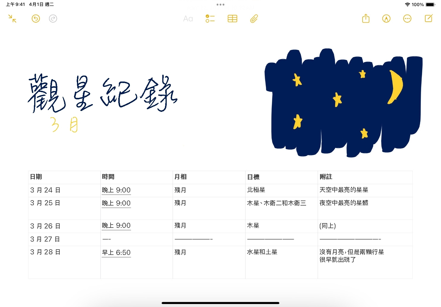 更進一步發揮。運用「備忘錄」和 Apple Pencil 製作一個禮拜、一個月,或一整年的觀星記錄。記下你對空中天體的觀察,包括日期、時間,還有你的發現。