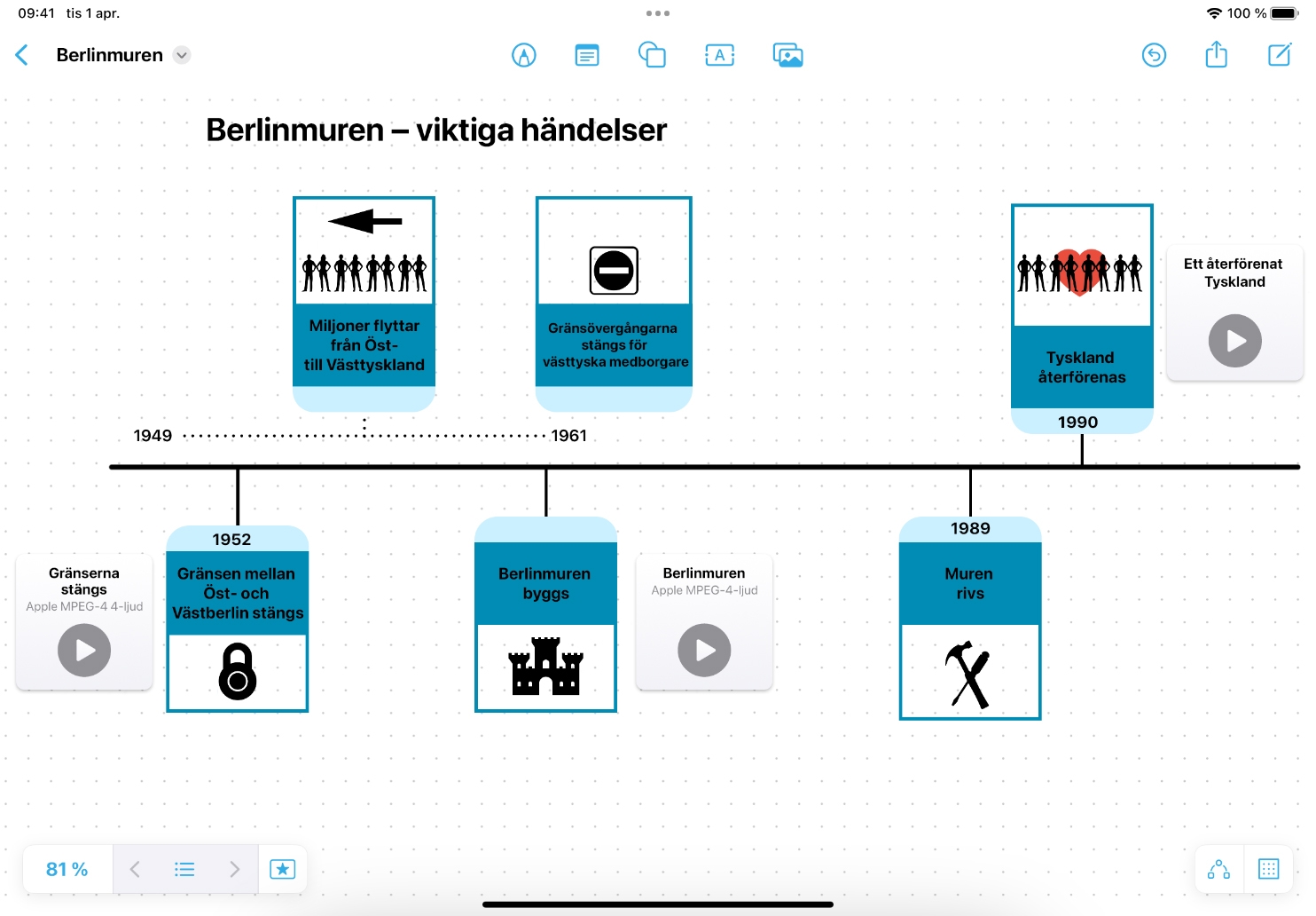Ta nästa steg. Använd Freeform för att skapa en tidslinje över de historiska händelserna kring byggandet av Berlinmuren. Ordna tidslinjen och gör den mer visuellt tilltalande med skärmavbilder, former och textrutor.