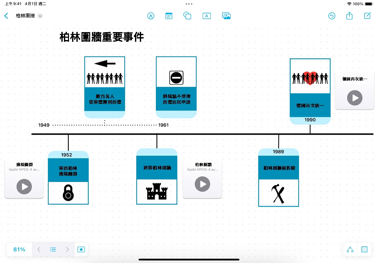 更進一步發揮。運用「無邊記」製作時間軸,並依發生順序排列和建造柏林圍牆相關的歷史事件。運用截圖、形狀和文字框組織時間軸,並加強視覺呈現效果。