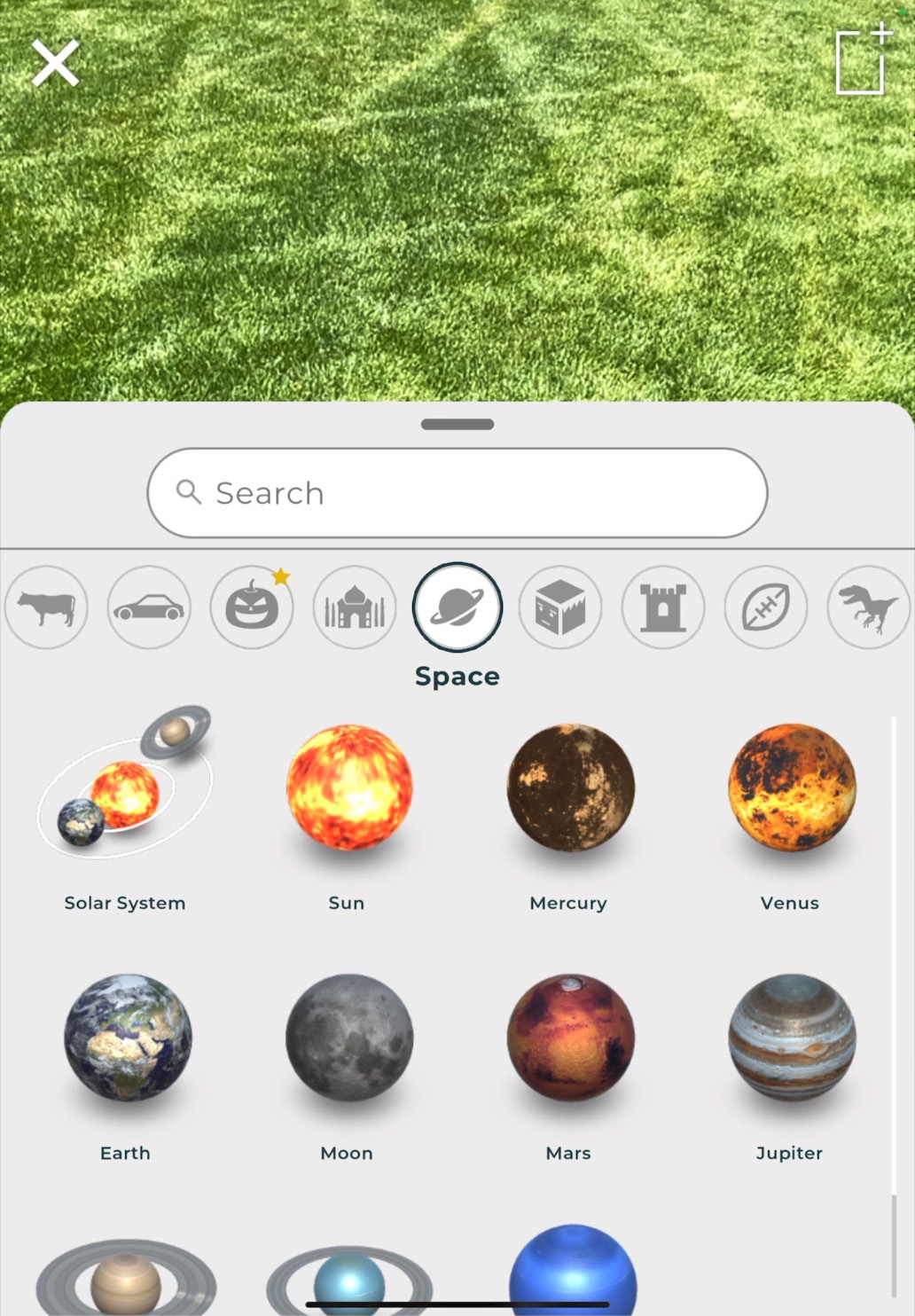 選擇模型。在瀏覽器中左右滑動以瀏覽模型選集,例如「Basic Forms」(基本形狀)、「Animals」(動物) 或「Learning Space」(學習空間)。捲動以檢視每個選集中的所有物件。點一下任何模型,然後點一下「Select」(選擇) 。
