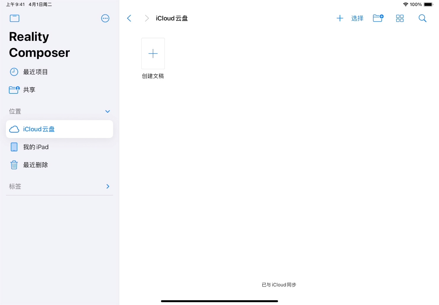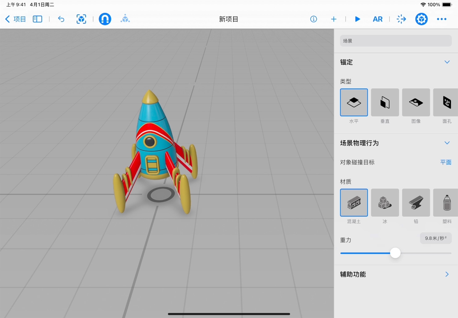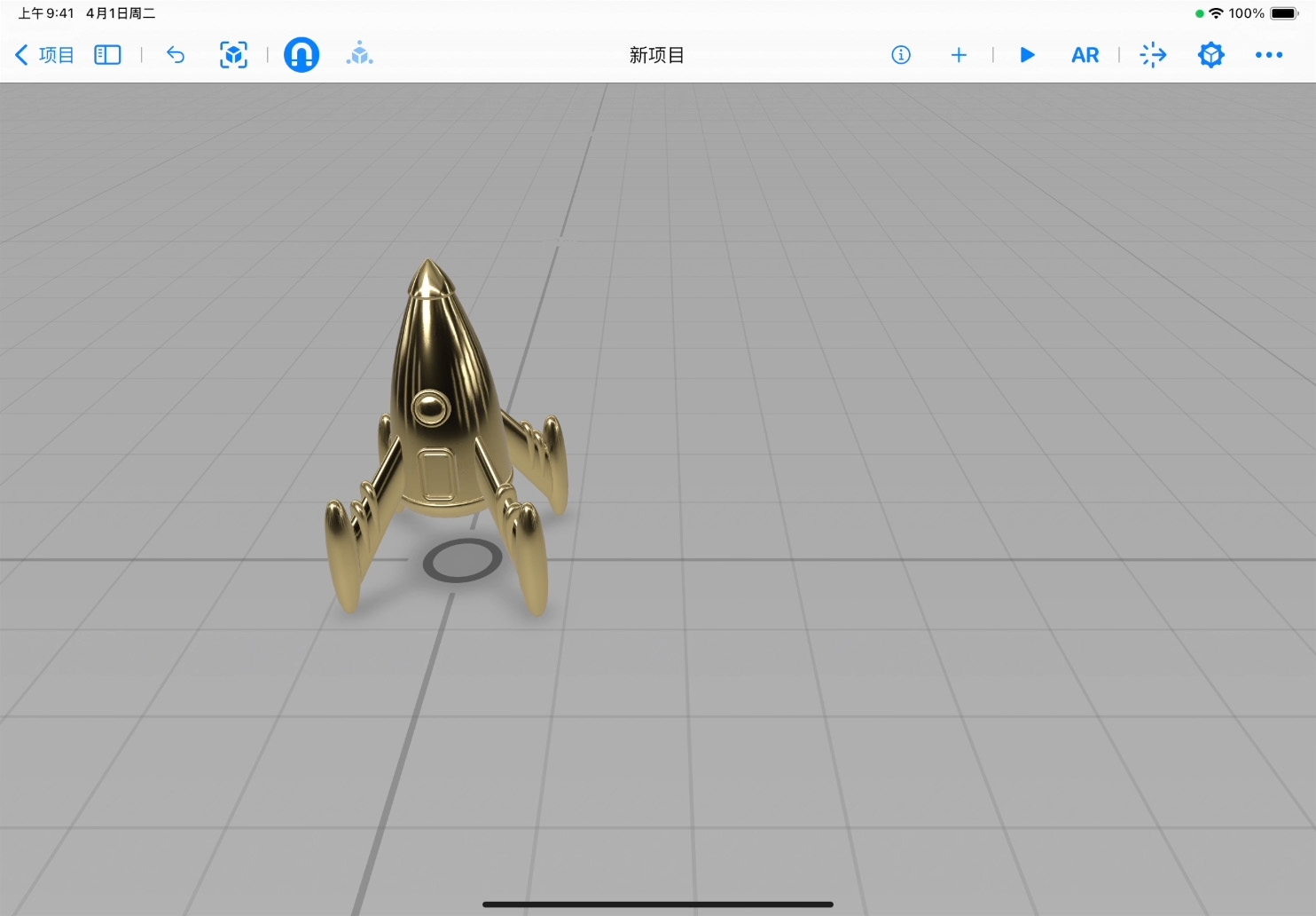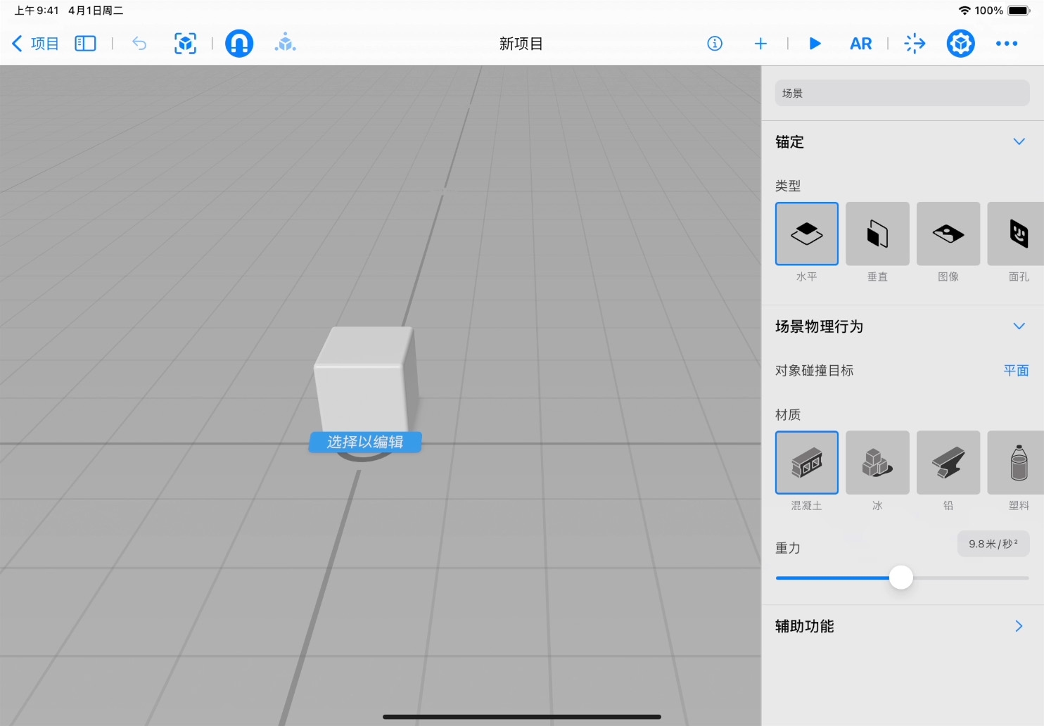 创建一个新项目。轻点创建,然后轻点水平锚点以放置你的对象。你的工作区中将出现一个立方体。