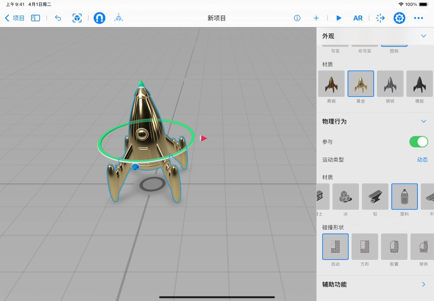 添加外观。轻点对象,然后调整对象的位置、旋转角度、缩放比例、外观效果和物理属性。