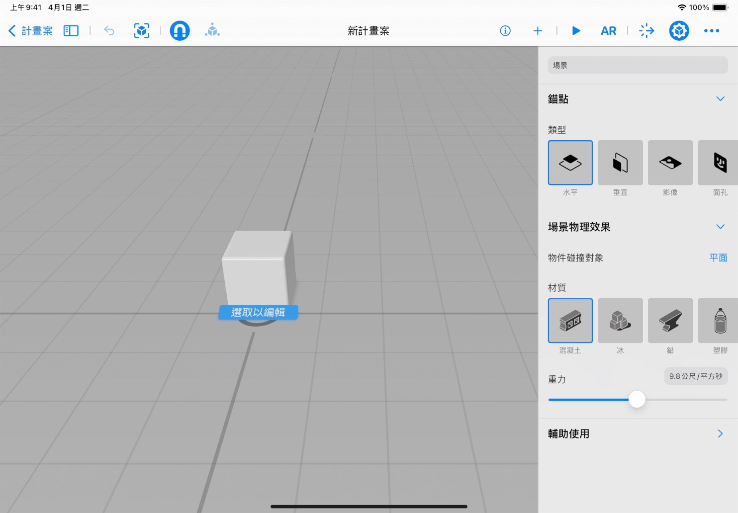 建立一個新計畫案。點一下「製作」,然後點一下水平錨點放置物件。工作空間中隨即出現一個立方體。