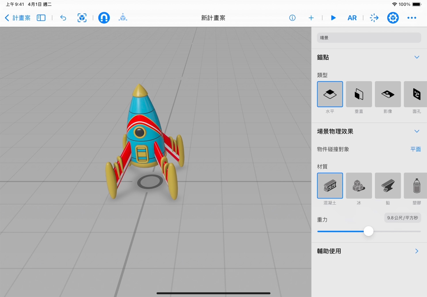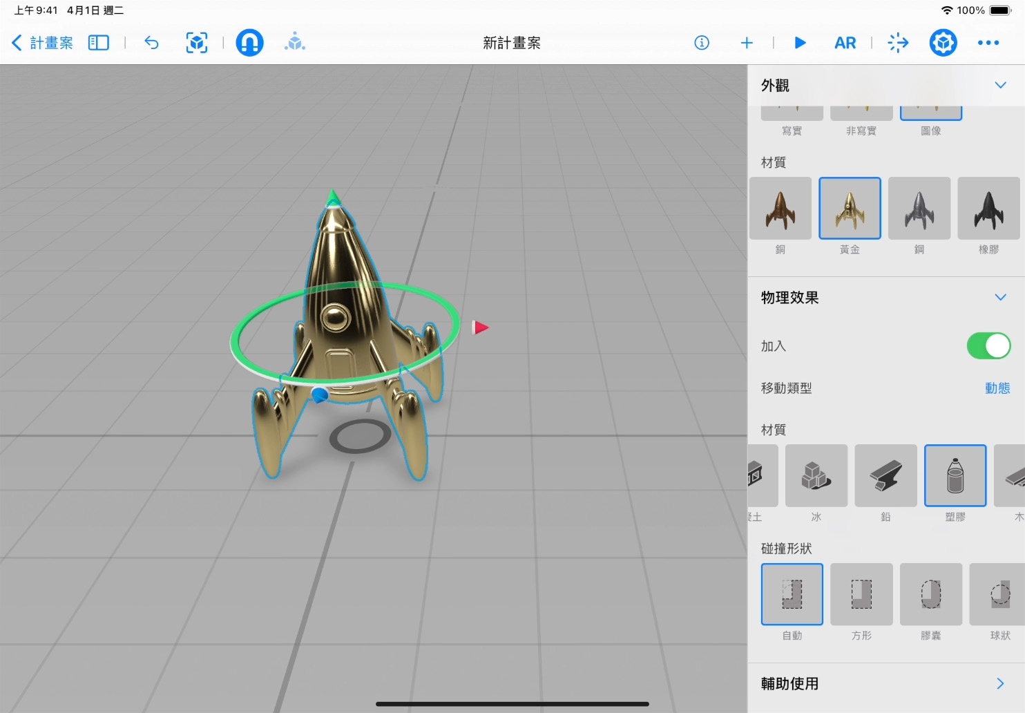 加入外觀。點一下物件,然後調整物件的位置、旋轉、縮放、外觀和物理效果。