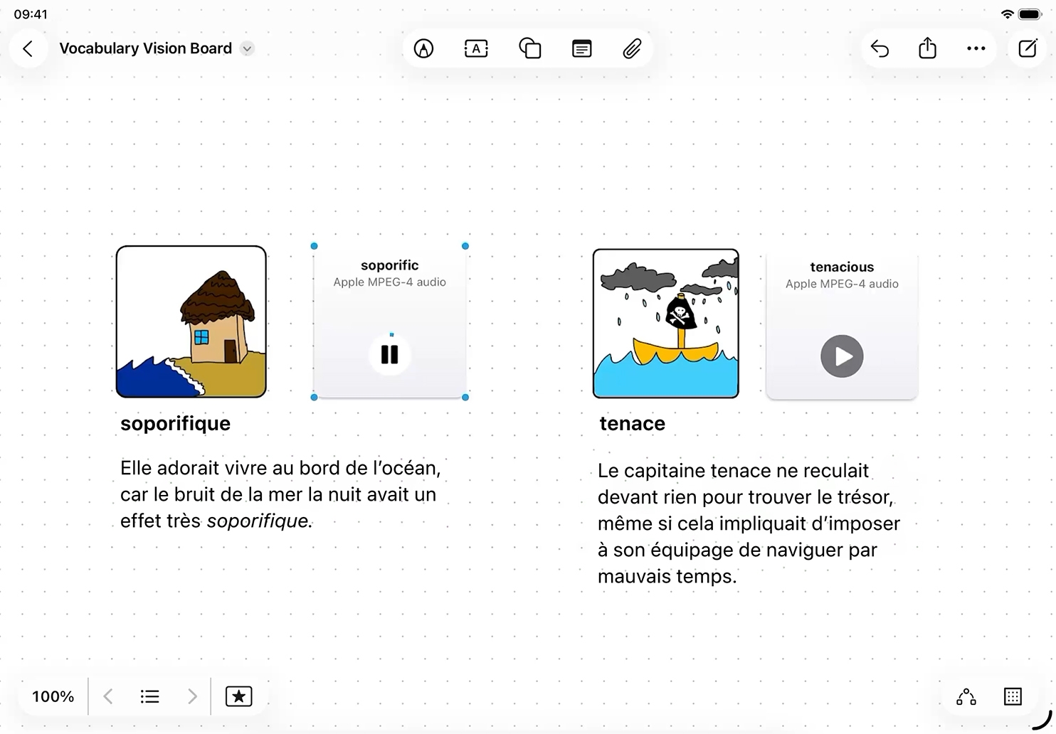 Demandez aux élèves de démontrer le sens de différents mots de vocabulaire en les mimant dans de courtes vidéos qui peuvent être ajoutées à Freeform.