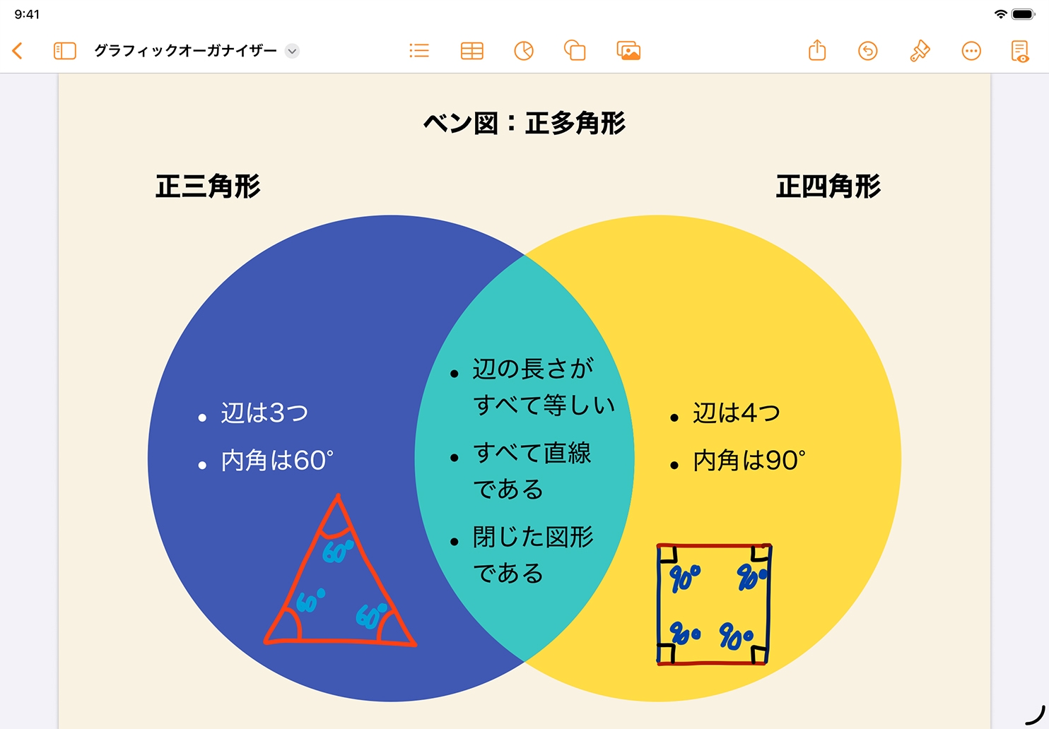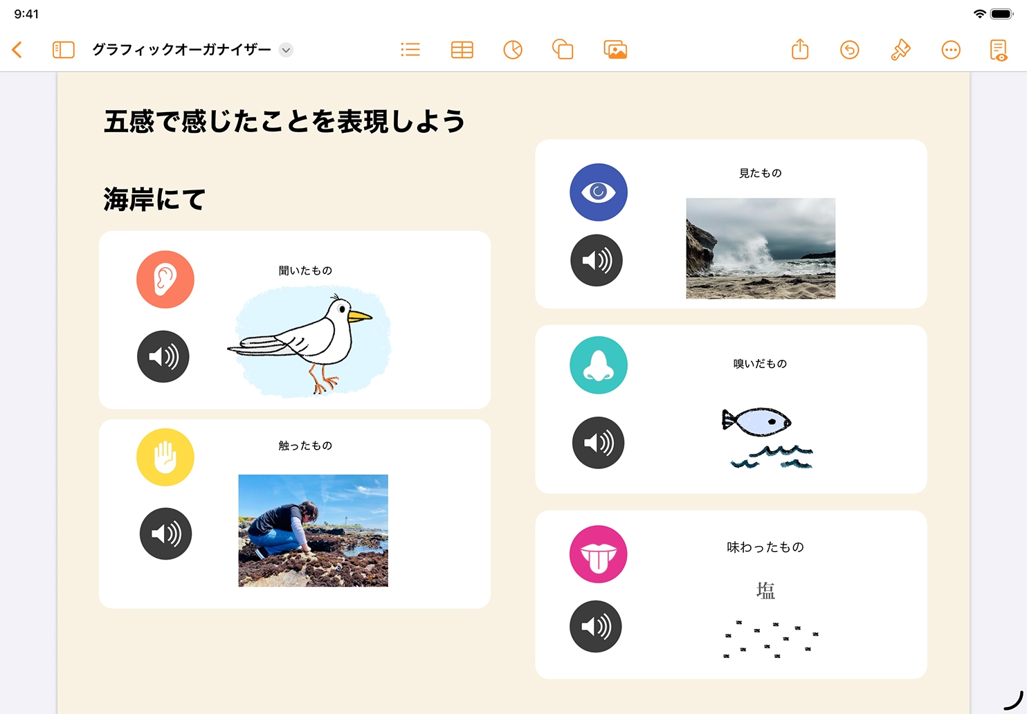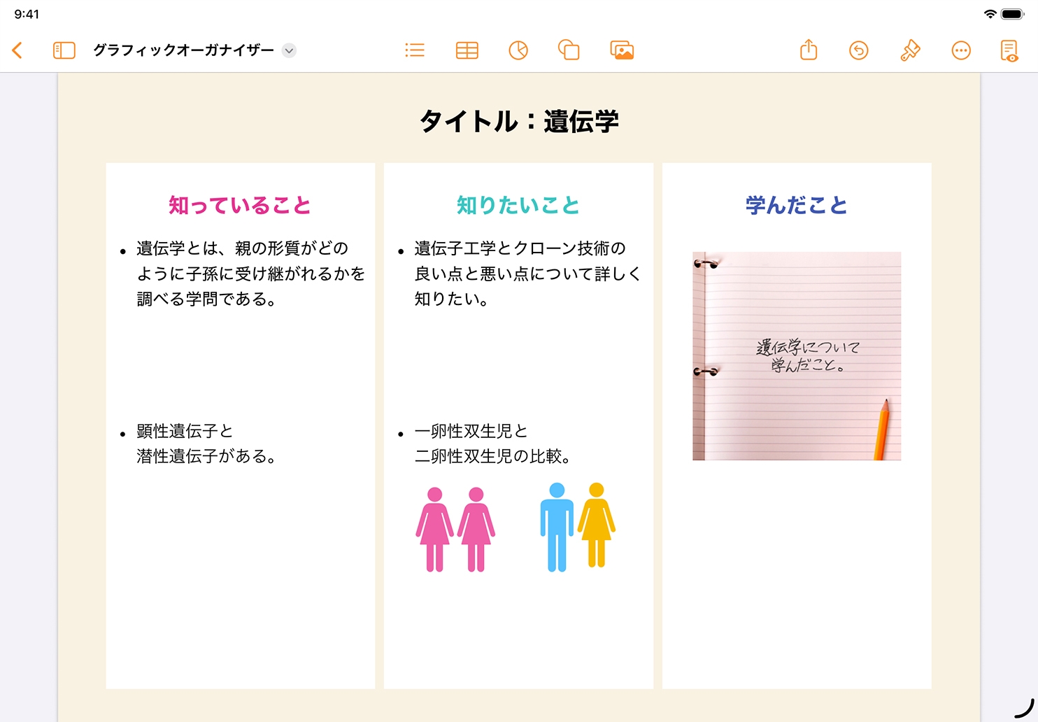 Pagesで書き込めるグラフィックオーガナイザーを使って、生徒たちに新しい情報を収集し、カテゴリ別に整理して、まとめてもらいましょう。テンプレートをカスタマイズすれば、どの教科でも利用できます。
