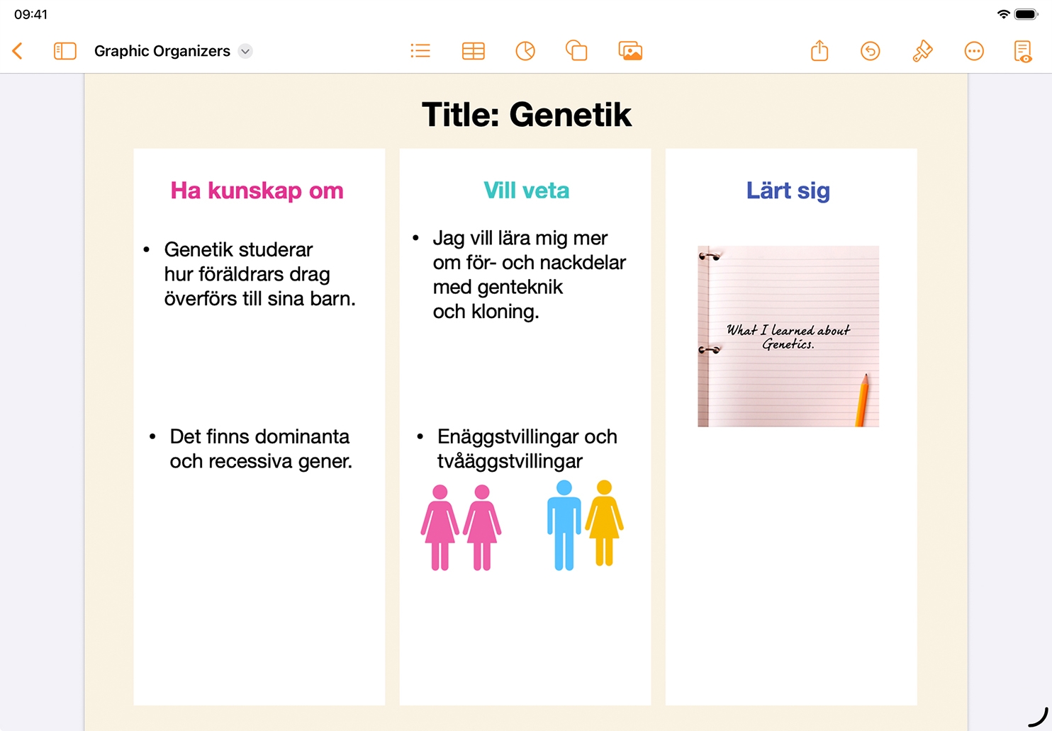 Gör dig redo att testa den här aktiviteten. Läs mer om hur du använder mallar i Pages för iPad och ladda ner en mall med en tankekarta.