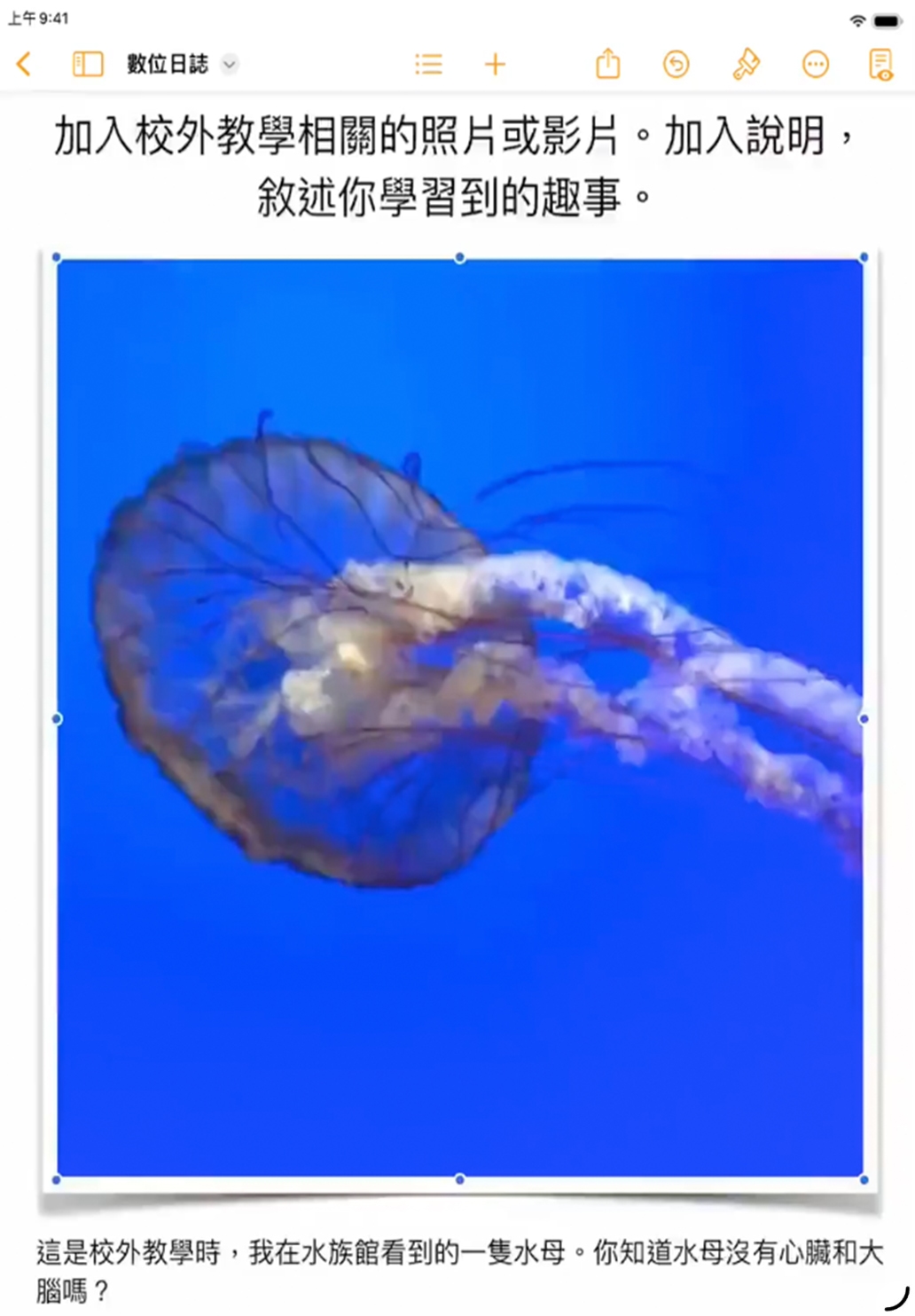 請學生使用 Pages 的互動式日誌,持續記錄自己的新構想 (例如社交情緒學習主題、時事、意見調查,或者文學主題),同時更熟悉 iPad 的各種技能。