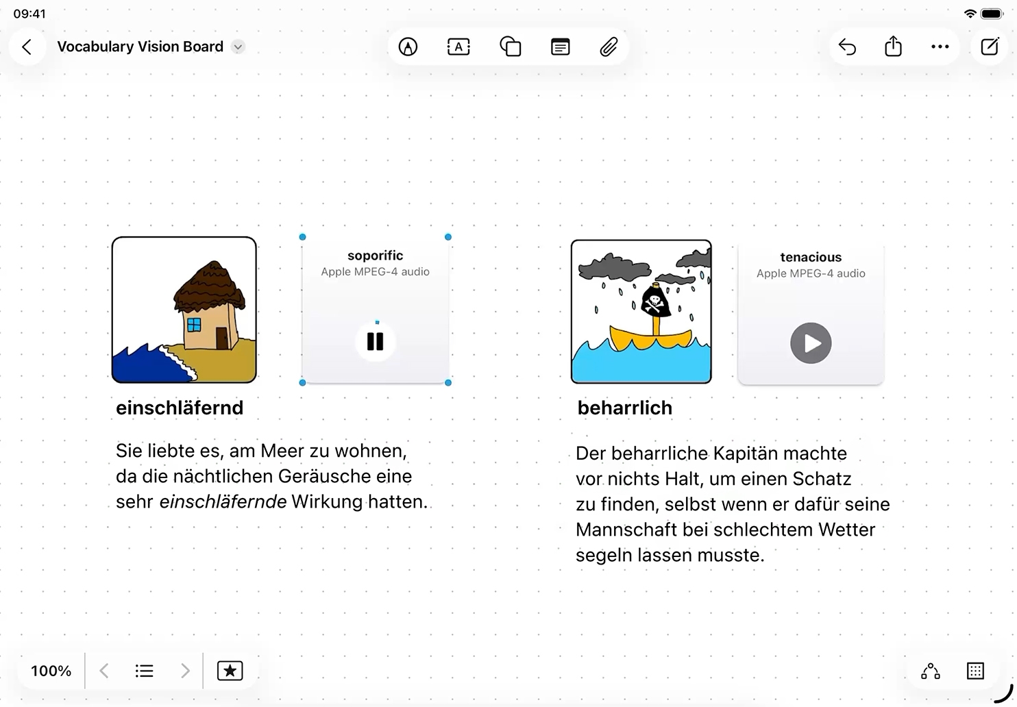 Helfen Sie Ihren Schüler:innen, ihren Wortschatz und ihre Sprachkenntnisse zu erweitern, indem Sie in Sprachmemos erstellte Audioaufnahmen und Fotos oder Zeichnungen in Freeform kombinieren.