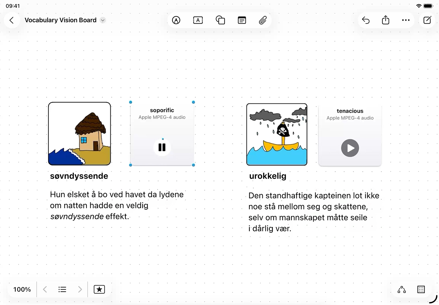 Hjelp elevene med å utvide ordforrådet sitt og forbedre leseferdighetene sine ved å kompilere lydopptak fra Taleopptak og bilder eller tegninger laget i Freeform.