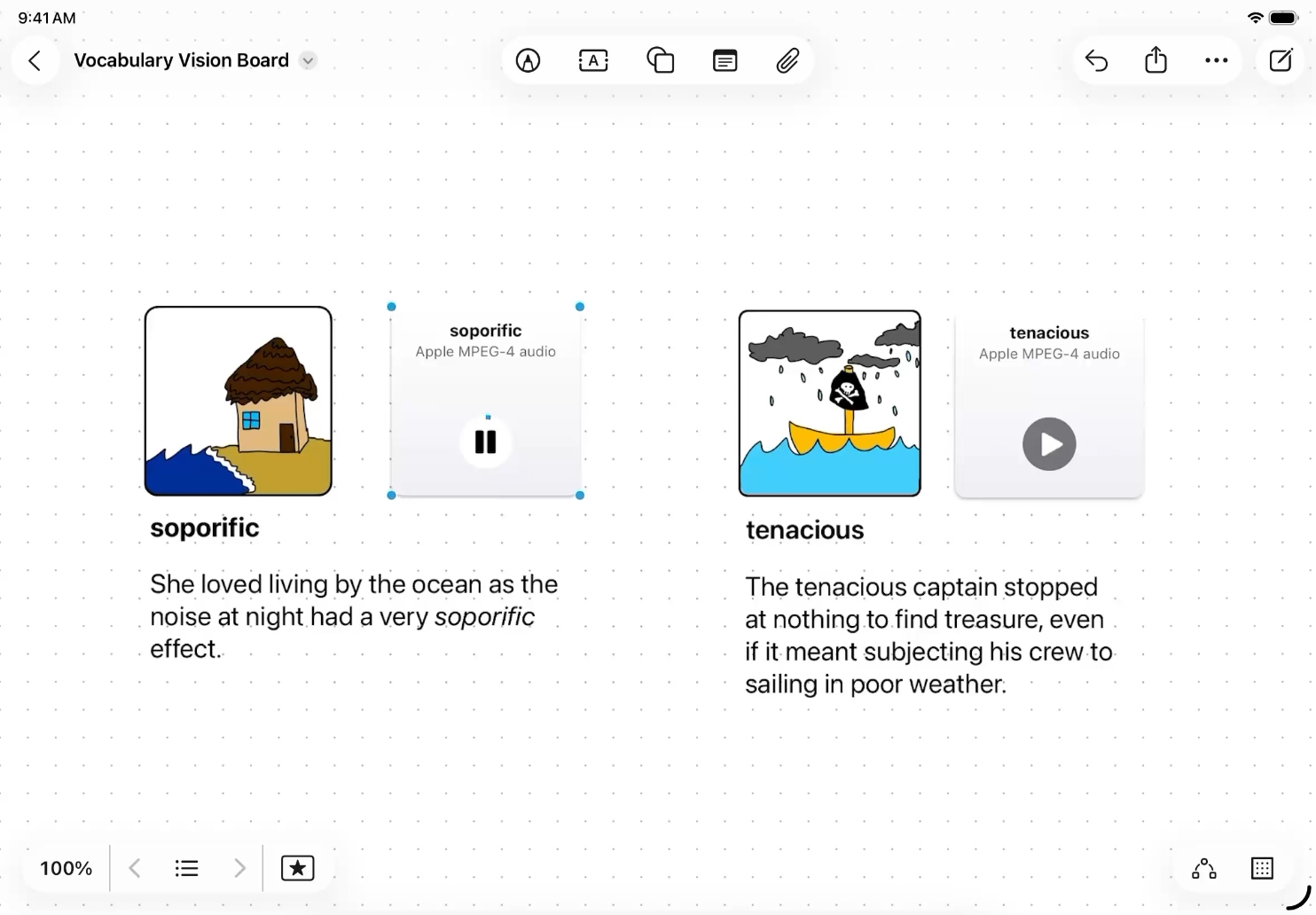 Hjälp eleverna att bygga upp sitt ordförråd och flyt genom att kombinera ljudinspelningar från Röstmemon och bilder eller teckningar från Freeform.