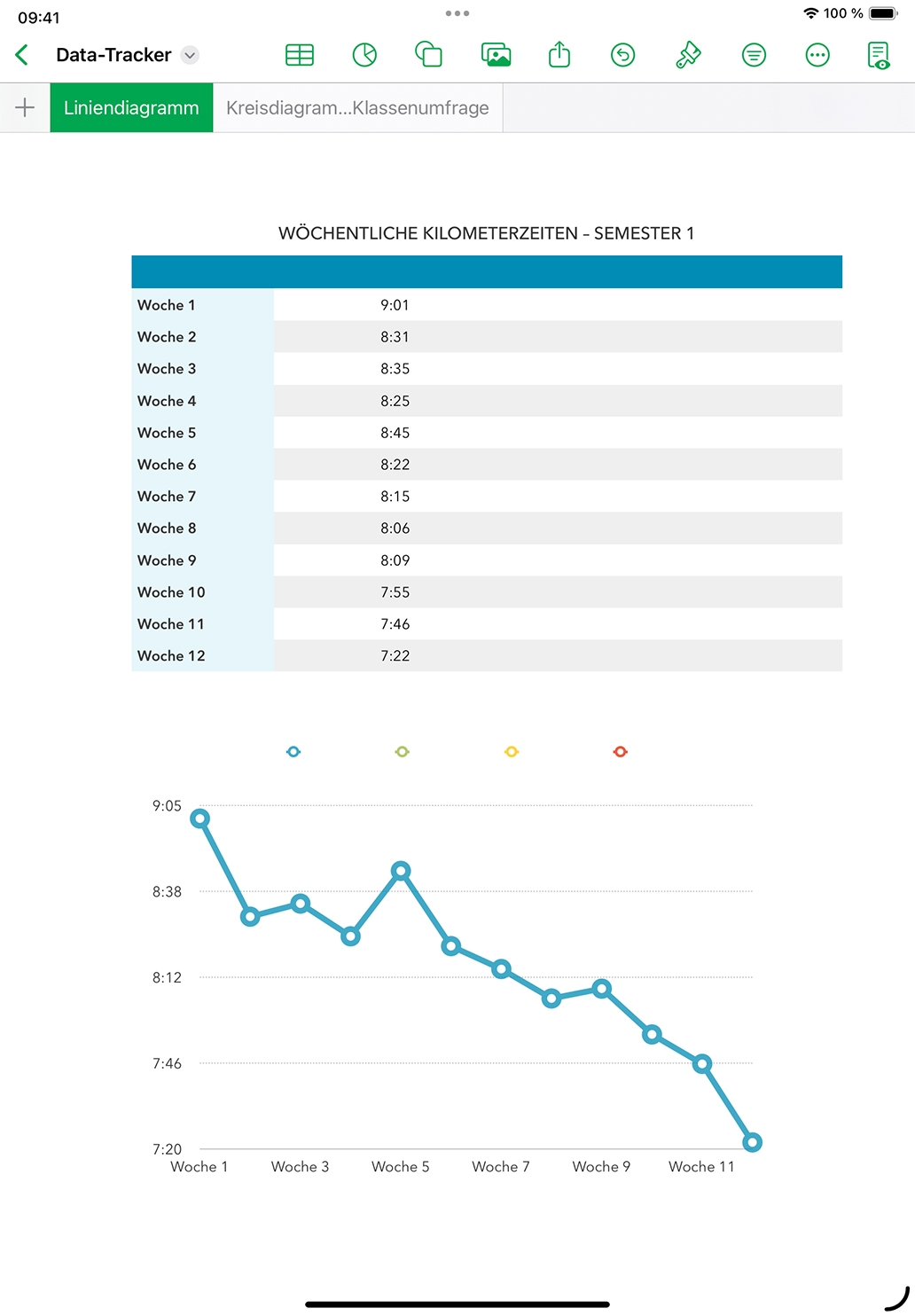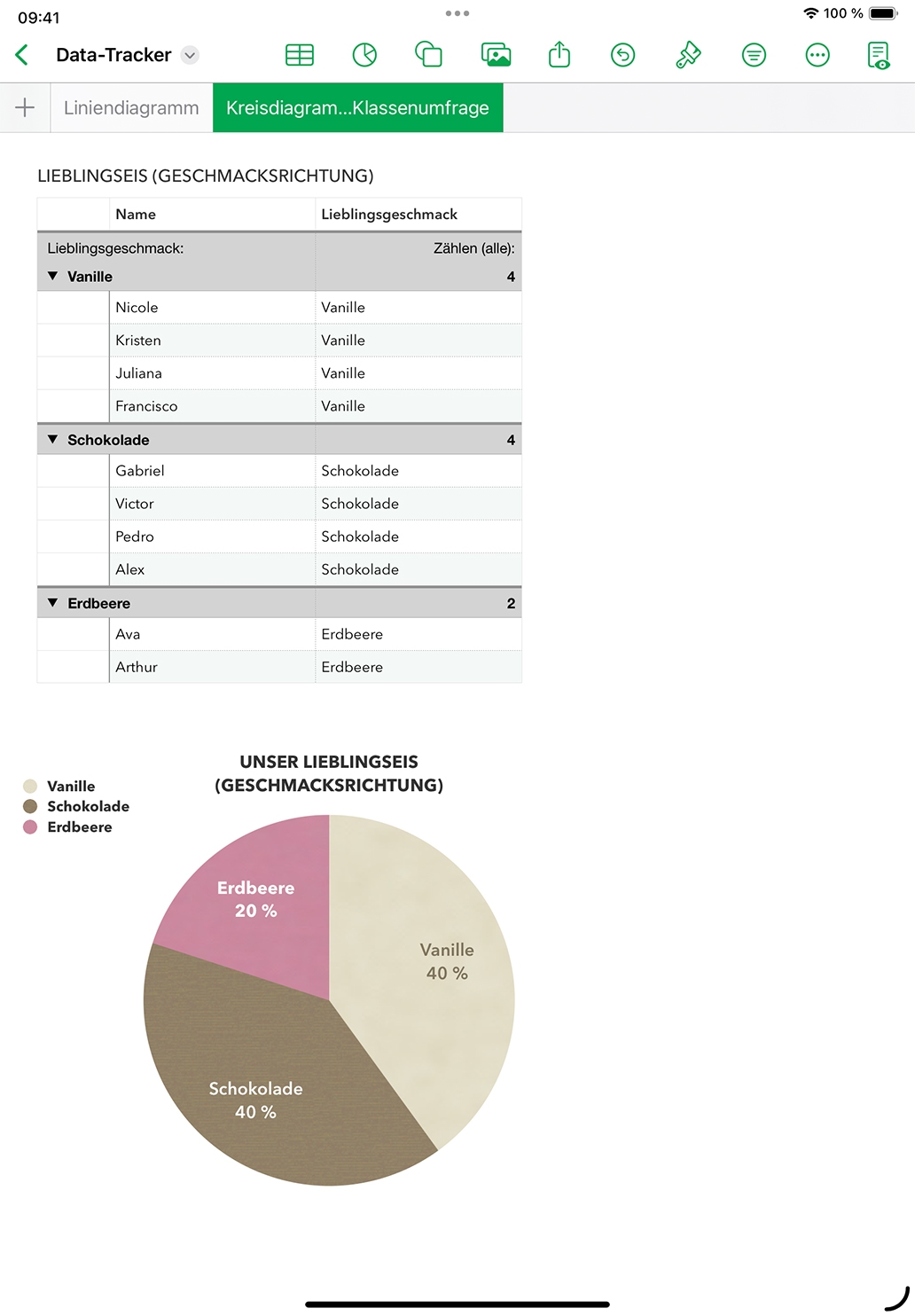 Fordern Sie Ihre Schüler:innen auf, Daten in einer Tabellenkalkulation in Numbers zu visualisieren. Dabei können sie Messwerte verfolgen, die sich im Laufe der Zeit ändern, oder die Ergebnisse einer Umfrage oder einer anderen Studie darstellen.