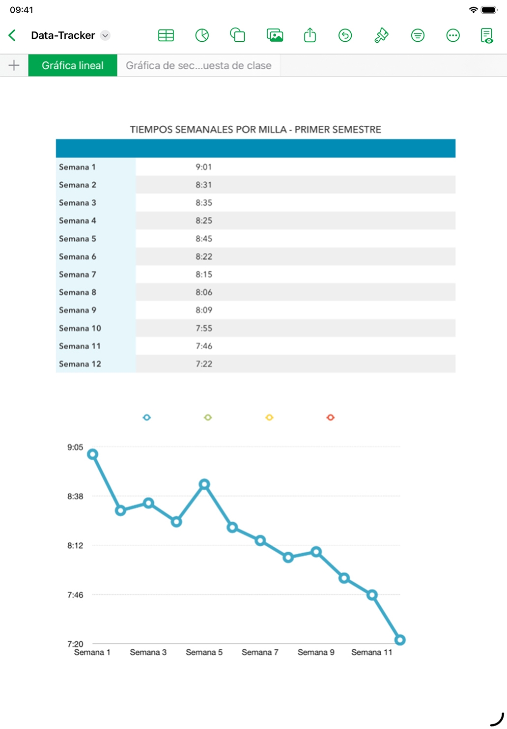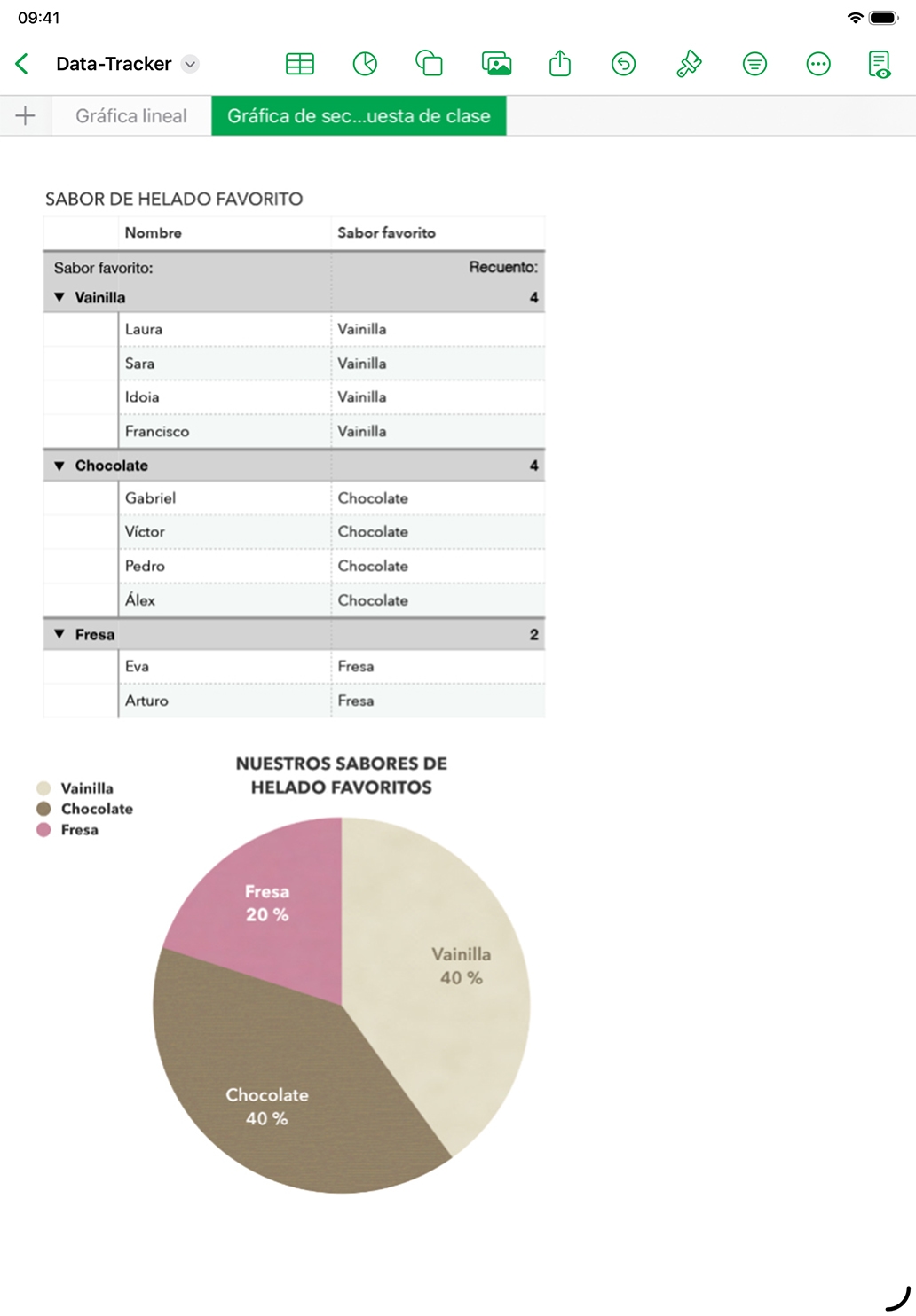 Pide a los alumnos que visualicen un conjunto determinado de datos en una hoja de cálculo de Numbers que lleve un registro de los cambios en las medidas o que representen los resultados de una encuesta u otro tipo de estudio.