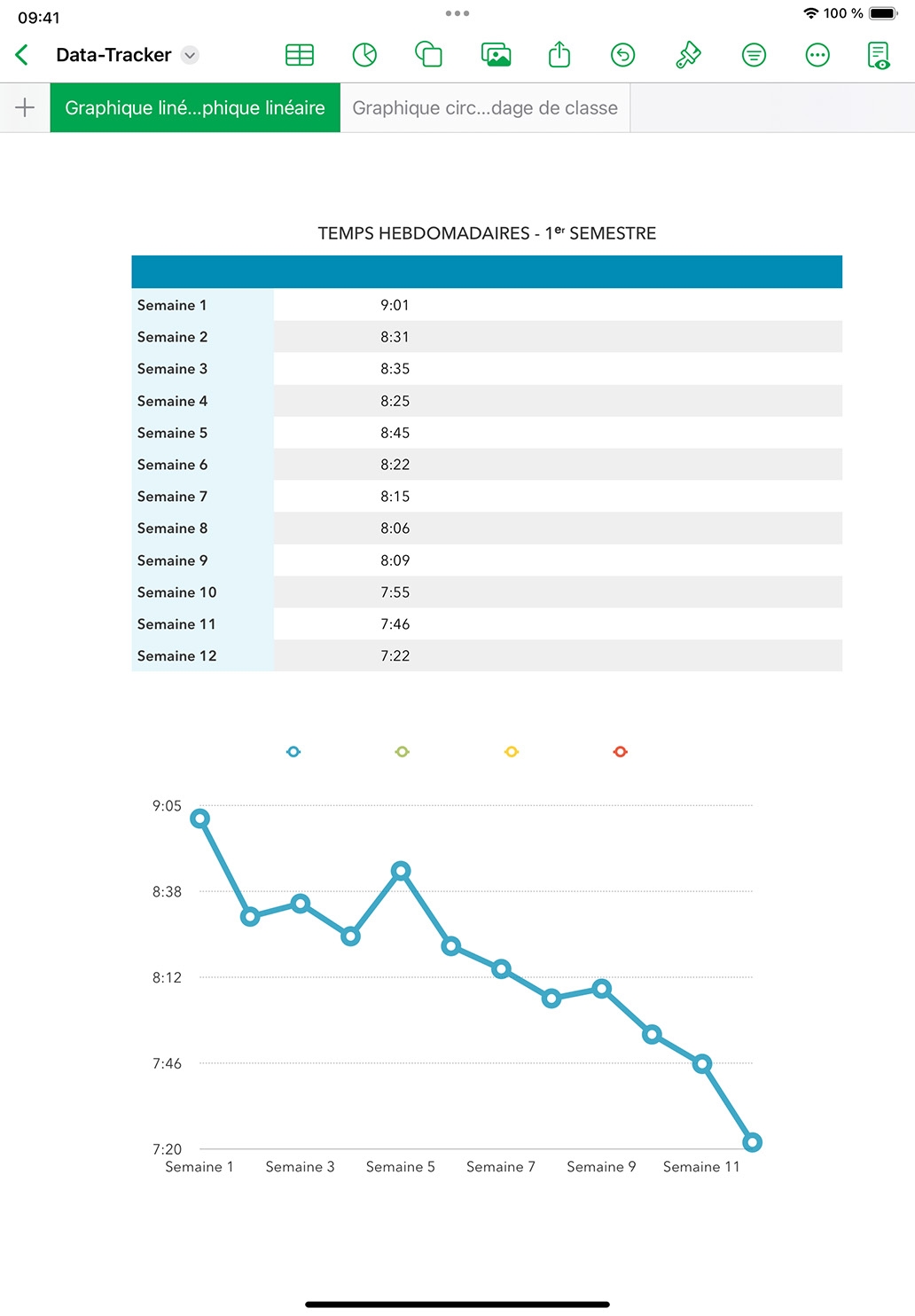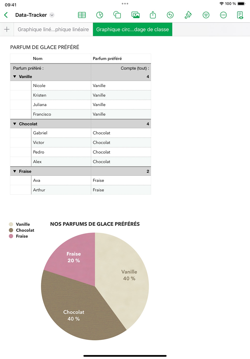 Demandez aux élèves de représenter visuellement dans une feuille Numbers des mesures prises à différents moments ou les résultats d’une enquête ou d’une étude.