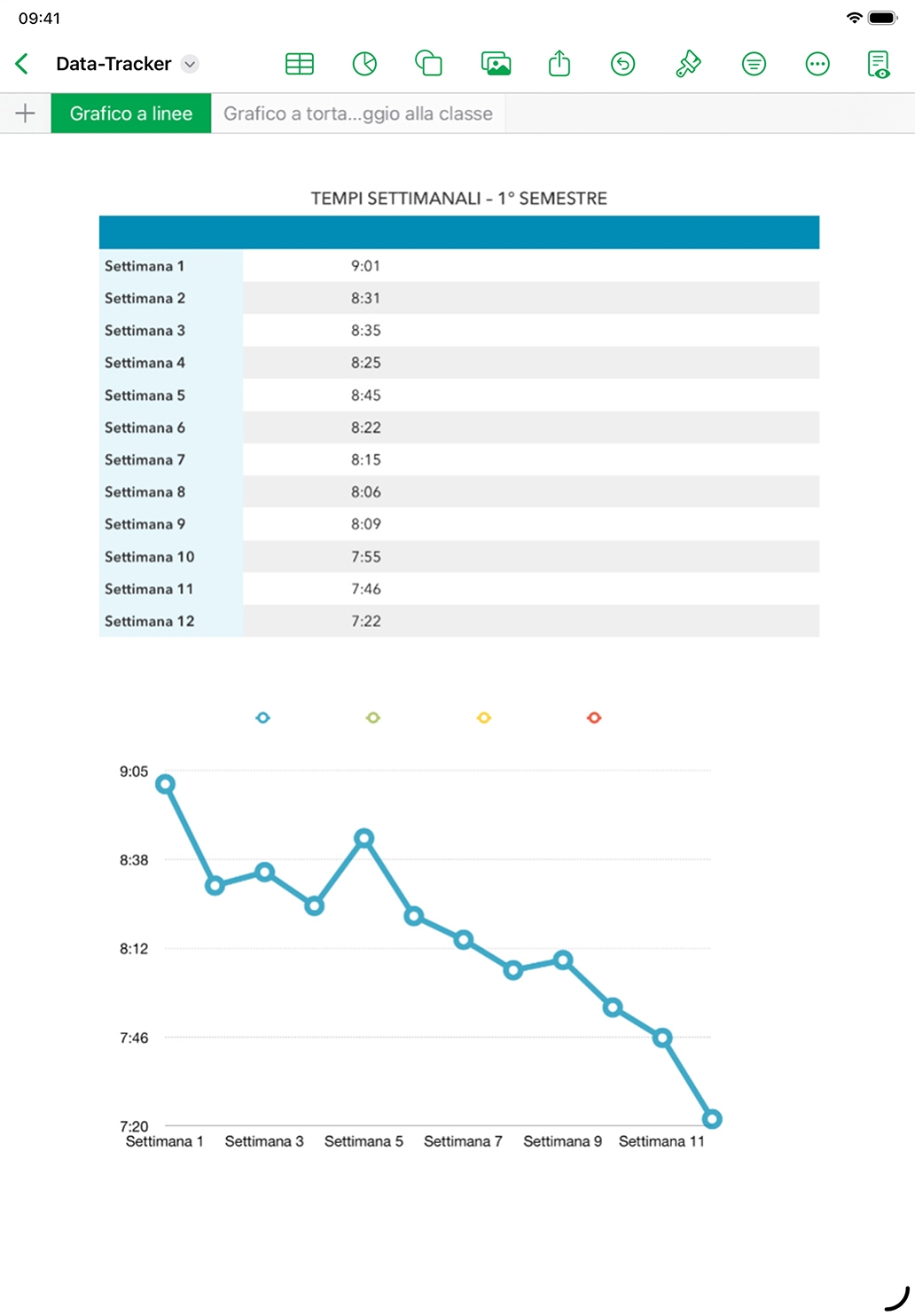 Crea un diario degli allenamenti usando Numbers per registrare l’attività fisica a intervalli giornalieri o settimanali. Tieni traccia di statistiche come la distanza e il tempo, e crea un grafico a linee per mostrare l’andamento.