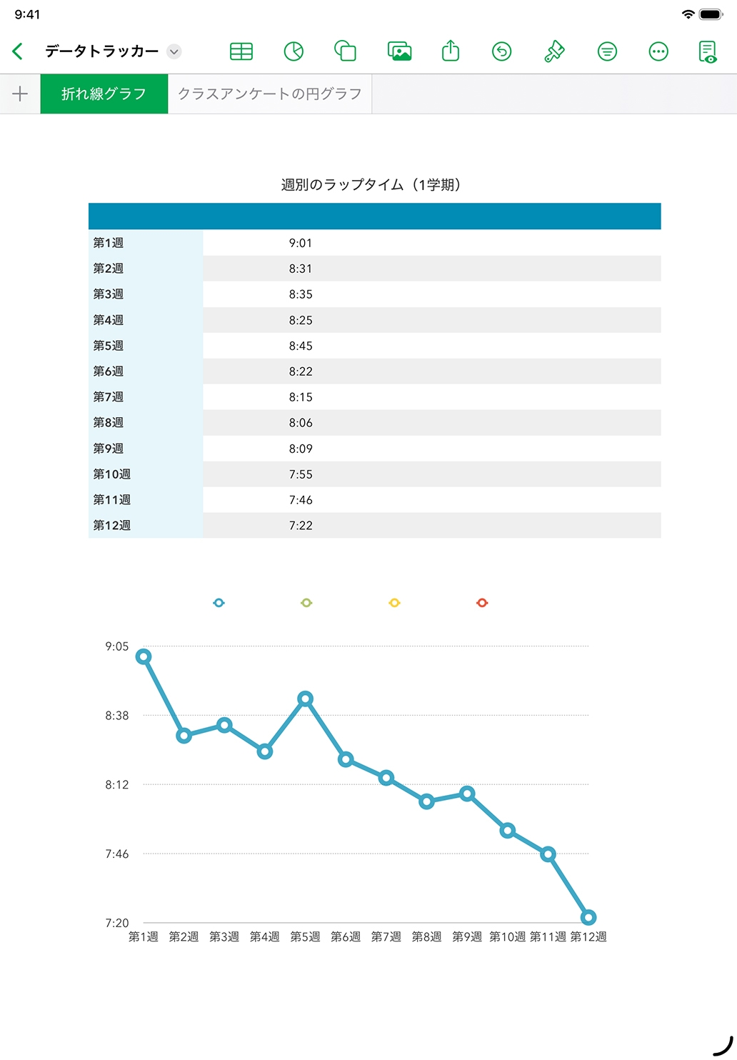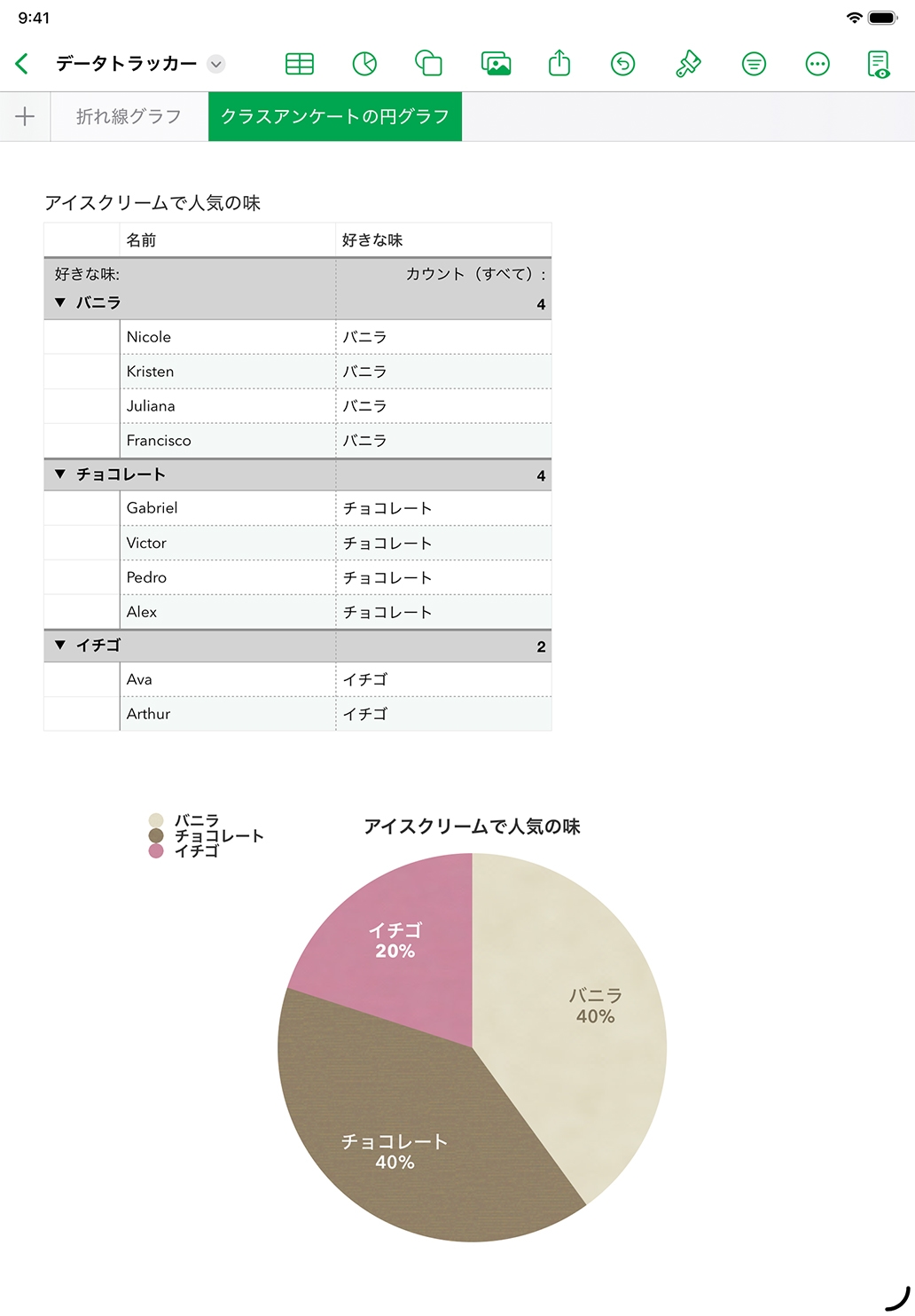 Numbersのスプレッドシートを使って、時間の経過に伴って変化する数値を継続的に調べて記録したデータを視覚的に表現したり、アンケートなどの調査結果が一目でわかるようにまとめたりしてもらいましょう。