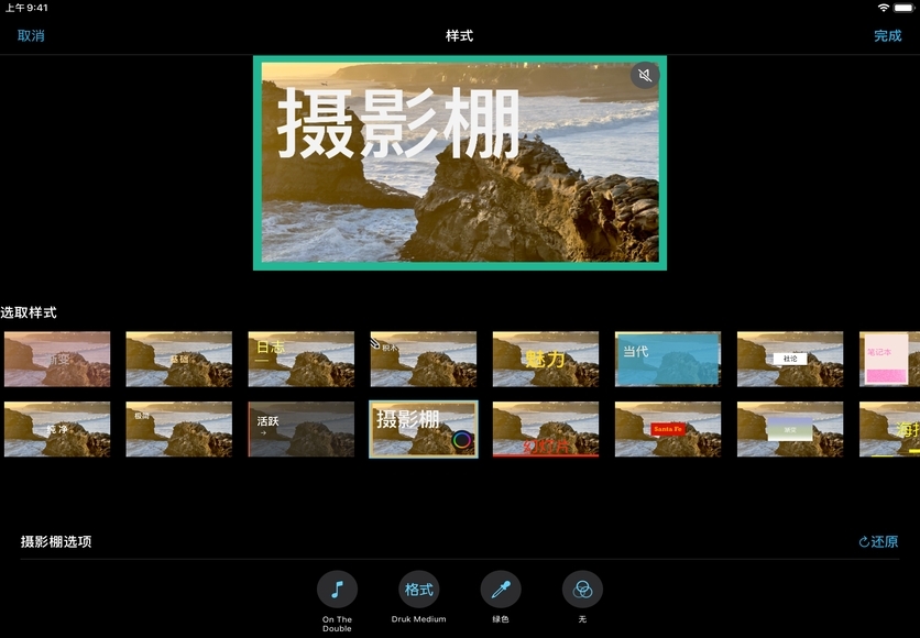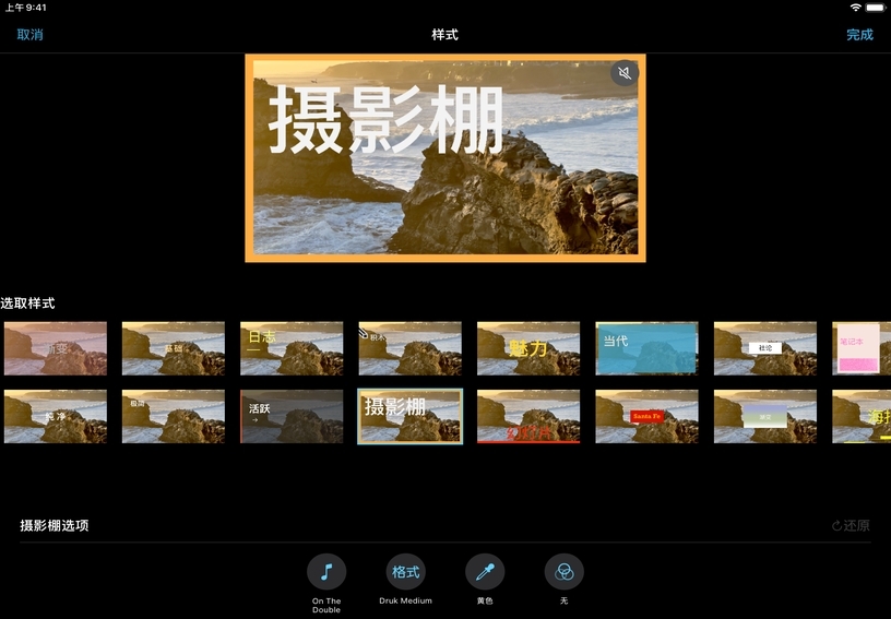 ,然后轻点一种样式将其选中并播放预览影片。每种样式都包含一首预设音乐曲目、一种字幕、多个转场和图形选项。然后轻点“完成”。