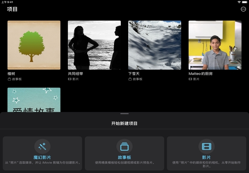 开始一个魔幻影片项目。轻点“开始新建项目”下方的“魔幻影片”
