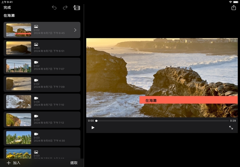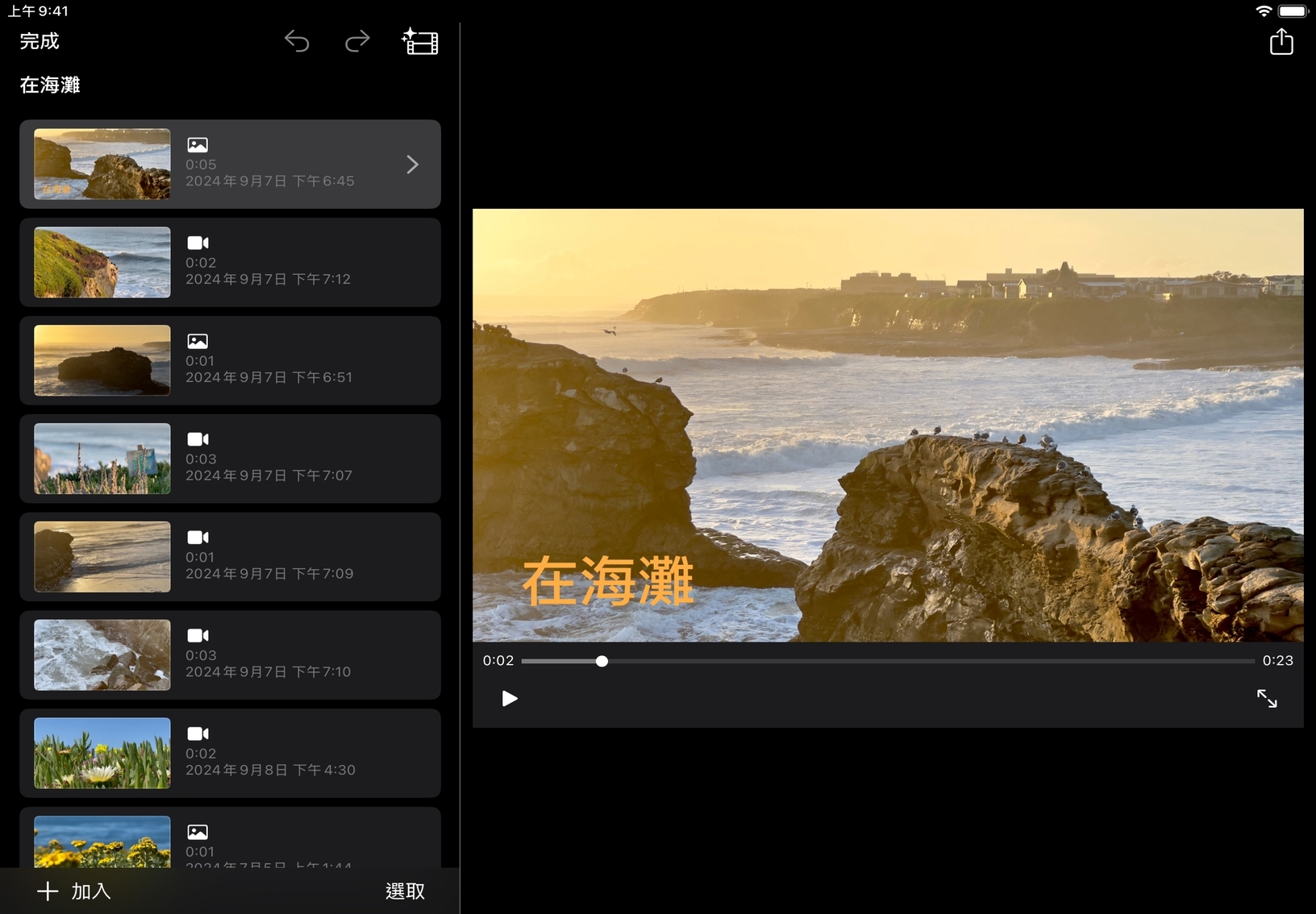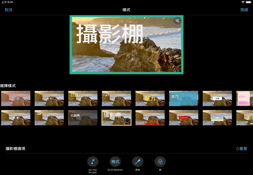 ,然後點一下以選取一個樣式並播放預覽。每種樣式都包含預設的一個音樂音軌、一個標題、多個過場效果和圖形選項。然後,點一下「完成」。