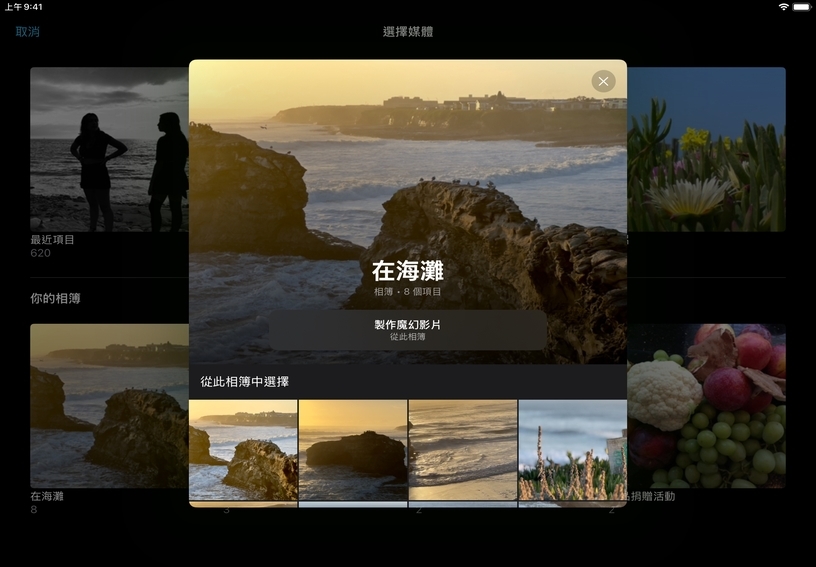 選擇你的媒體。點一下相簿,然後點一下「製作魔幻影片」來使用整個相簿。或者,點一下你要使用的特定剪輯片段和照片,然後點一下螢幕底部的「製作魔幻影片」。