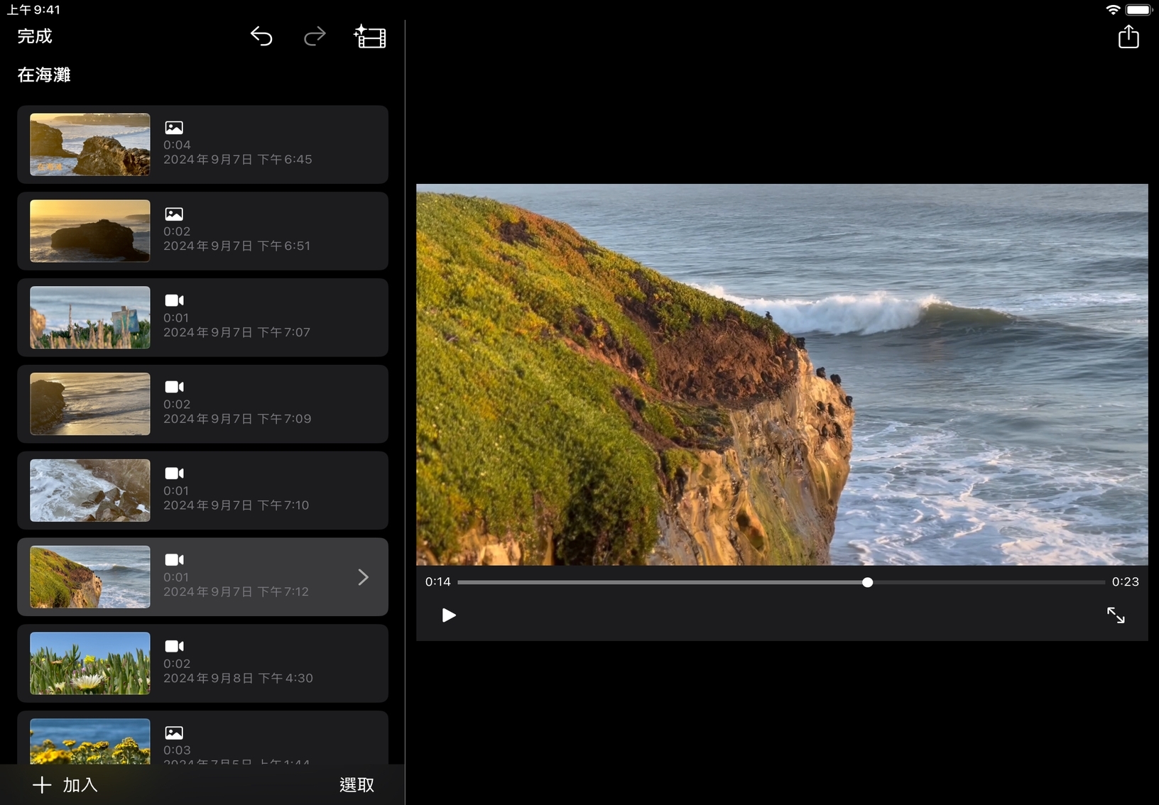 重新排列剪輯片段。按住一個剪輯片段,等它從列表中浮起,將其拖移到新位置,然後放開。