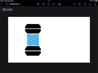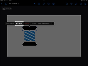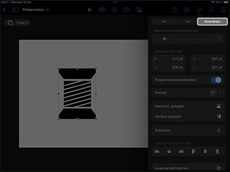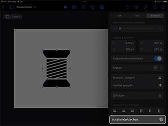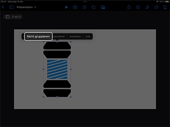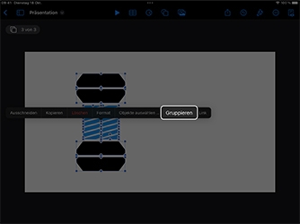 Einige Formen in Keynote können in kleinere Teile zerlegt werden. Diese können dann bearbeitet und neu angeordnet werden, um neue Formen zu erstellen. Sie können Formen auch gruppieren und als ein Objekt verschieben und die Größe ändern, wobei sie ihre eigene Form und ihren eigenen Stil beibehalten.