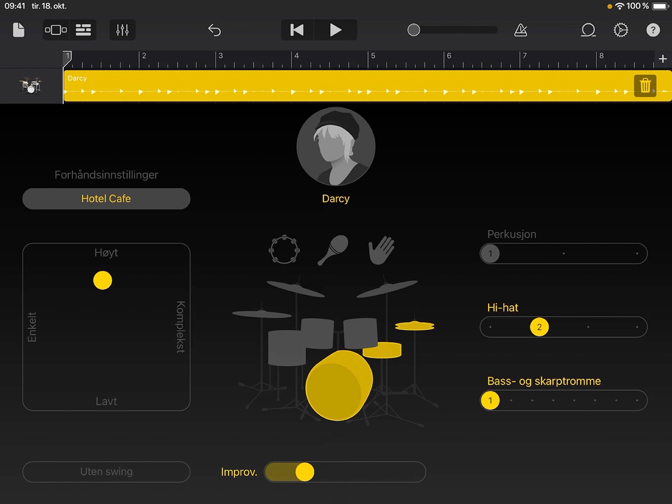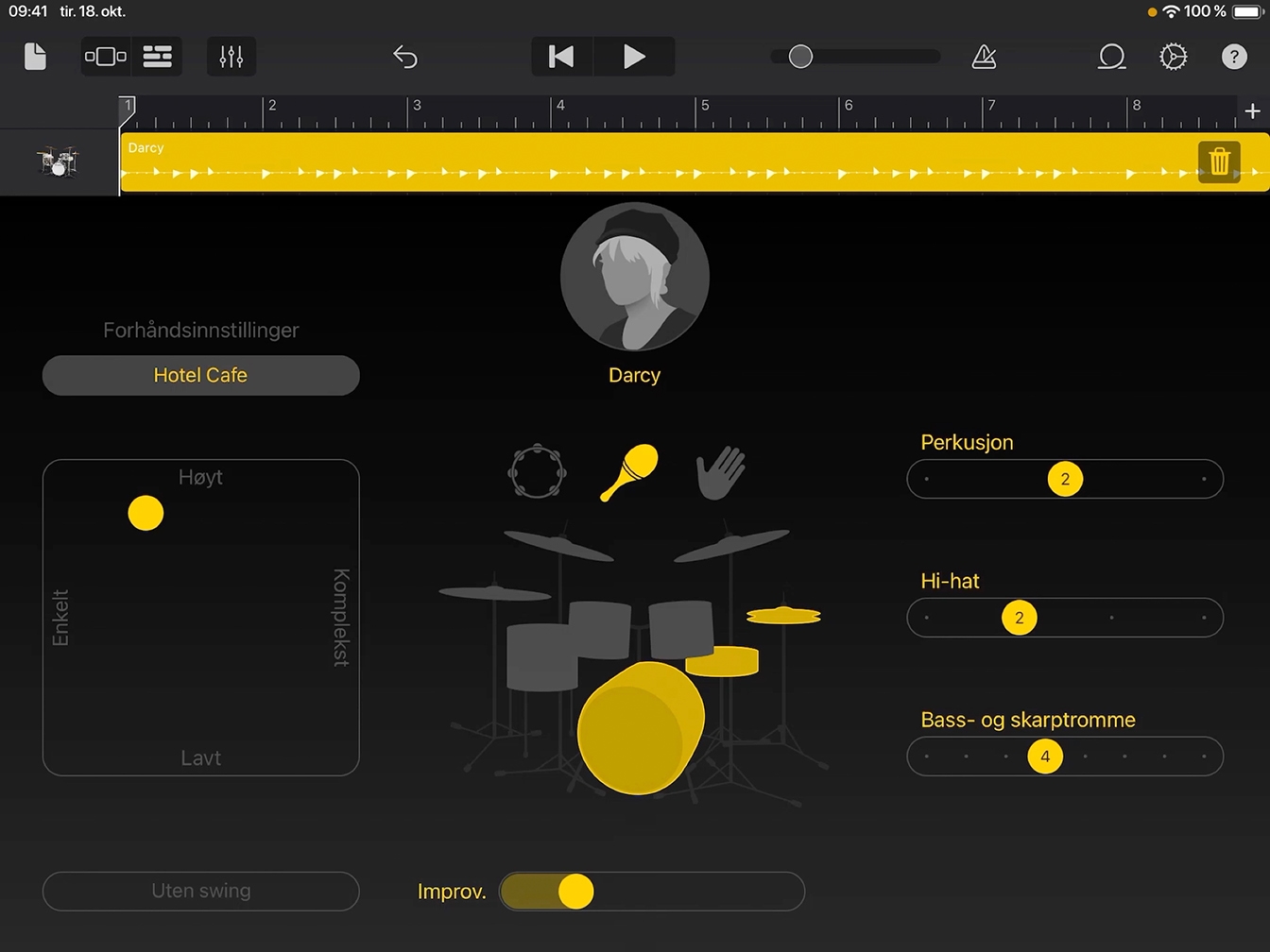 Skyv Improvisasjoner-skyveknappen til høyre for å legge til flere variasjoner, kalt improvisasjoner, til trommerytmen mens Darcy spiller.