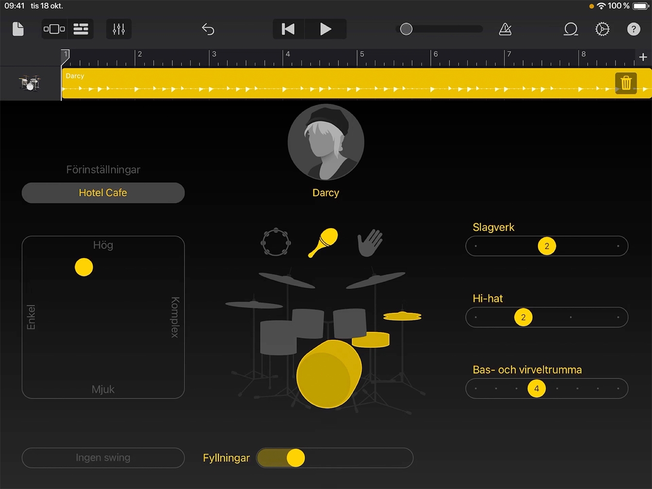 Dra reglaget Fyllningar åt höger för att lägga till fler variationer, så kallade fyllningar, i trumkompet när Darcy spelar.