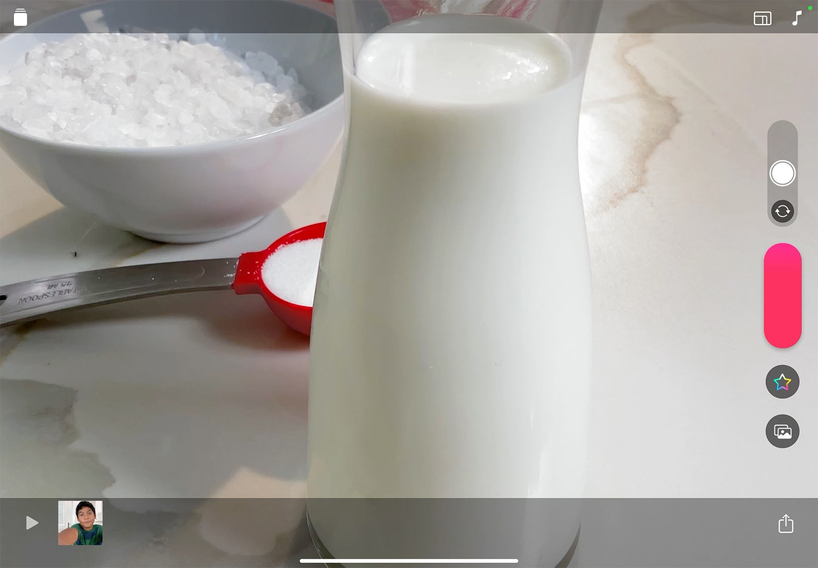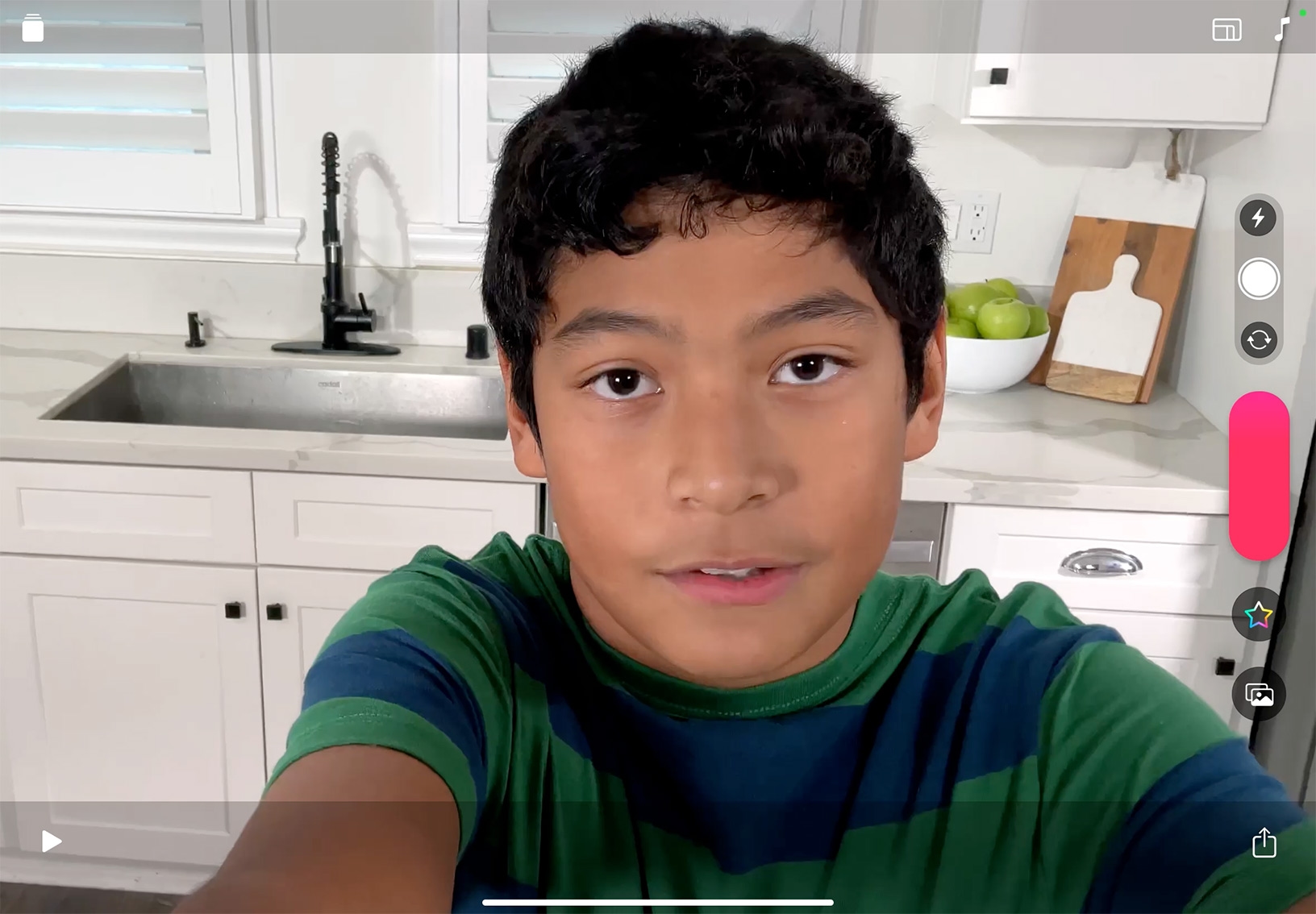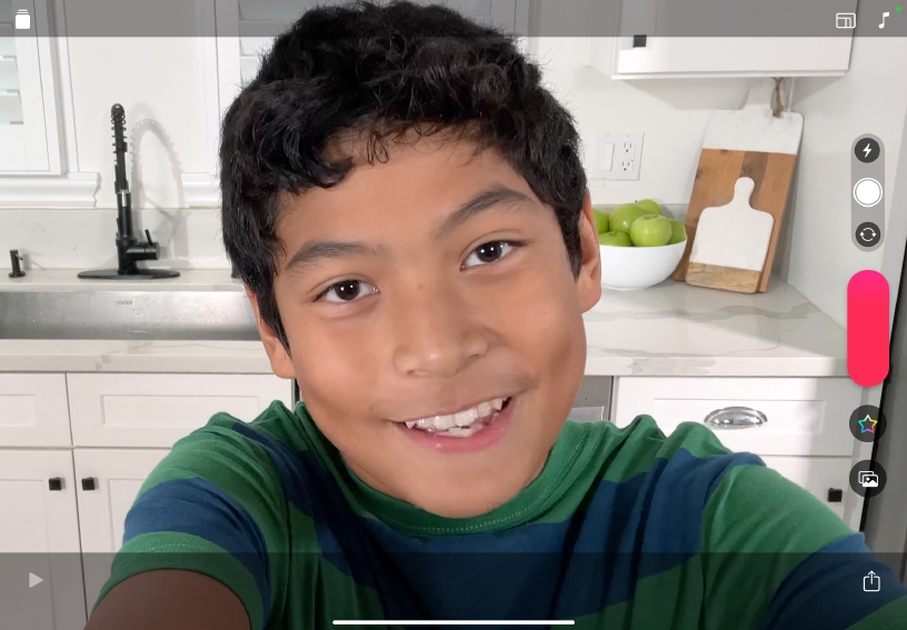 セルフィーのビデオクリップを撮影してみましょう。iPadを持ち上げてフレーム内に自分が写るように位置を調整したら、赤い録画ボタンをタッチして押さえたままにします。